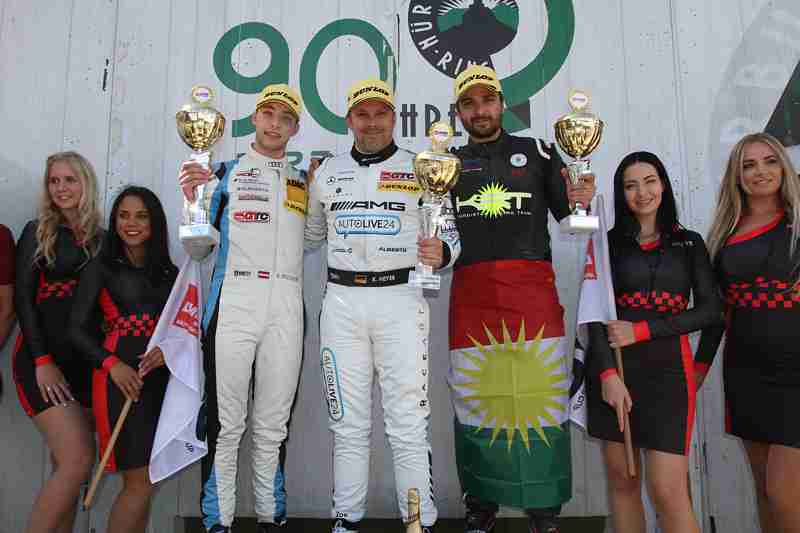 Die Ehre, ganz oben auf dem Treppchen zu stehen, gebührte Kenneth Heyer, der damit die knapp verpasste Zielankunft des AMG-Mercedes GT3 von Race-Art-Motorsport im Lauf ein paar Stunden zuvor wieder wett machte. Zweiter wurde Yaco-Racing-Fahrer Simon Reicher im Audi R8 LMS GT3, dessen zuvor geäußerte Hoffnungen auf Podiumsplätze an diesem Rennwochenende wahrlich erfüllt worden sind. Der dritte strahlende Sieger steuerte ebenfalls einen Audi R8 LMS GT3 im Schatten der Nürburg: Issac Tutumlu Lopez – der Mann mit einem türkischen und einem spanischen Nachnamen bei kurdischer Abstammung – ist ein in Barcelona lebender Fahrer bei Car Collection Motorsport. Seinen Angriff auf die Spitze nach dem Start konnte Tutumlu nicht halten, doch auch über den dritten Gesamtrang bestand Grund zur Freude: „Mein Auto wird vom Kurdistan Racing Team unterstützt, es ist sozusagen der erste Podiumsplatz für Kurdistan – ich bin sehr glücklich!“
