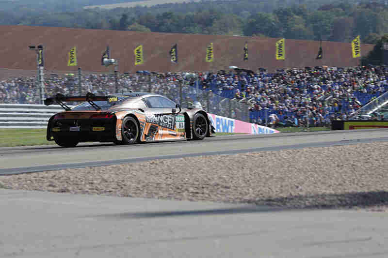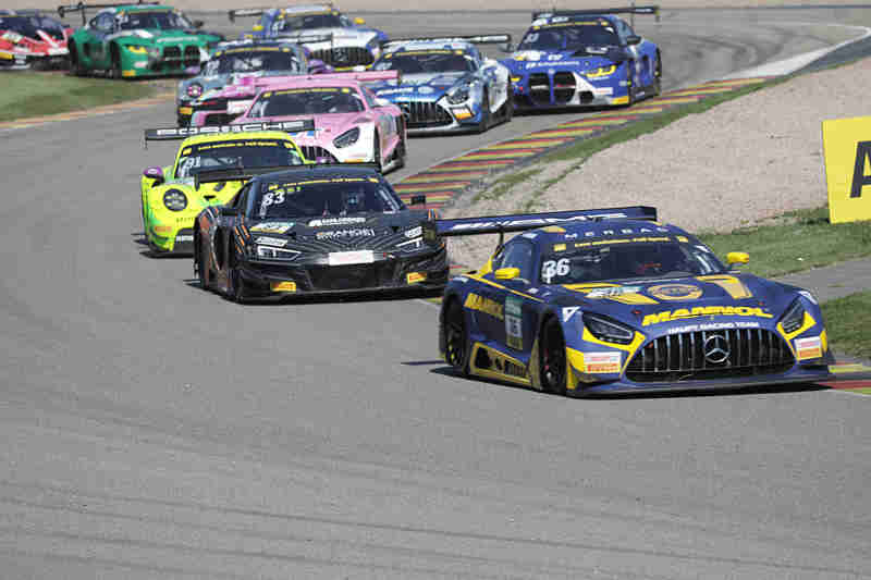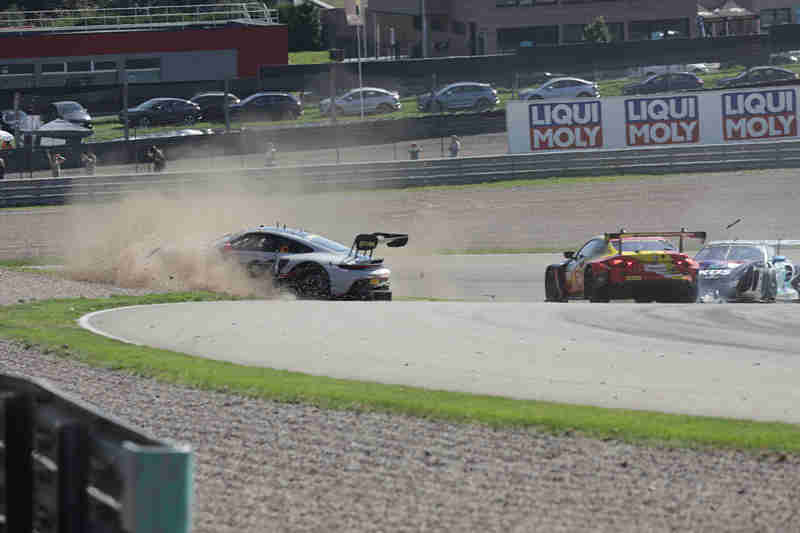Auch der zweite Start an diesem Wochenende funktionierte. Mirko Bortolotti zog nach dem fliegenden Start dann das Tempo an und führte die Meute in die erste Kurve. Jack Aitken versuchte dort zu attackieren, doch dabei verlor er seine zweite Position. Das Rennen musste dann mit der roten Flagge unterbrochen werden weil es plötzlich rund um Sheldon van der Linde zur Sache ging. Es kam dann zu einer Kettenreaktion. Maro Engel, Marvin Dienst und Laurin Heinrich kollidierten und landeten Im Kiesbett. Dennis Olsen war mit einem beschädigten Fahrzeug im Heckbereich in die Box gekommen. Ayhancan Güven war auch im Kiesbett gelandet. Er konnte seine Fahrt fortsetzen und lag danach auf Platz 22. Vorfall zwischen Sheldon van der Linde, Lucas Auer und Jusuf Owega wurde nach dem Rennen von den Sportkommissaren untersucht. Die Piloten kamen nun auf Start und Ziel zurück und stellten sich dort dann zum Re-Start auf.