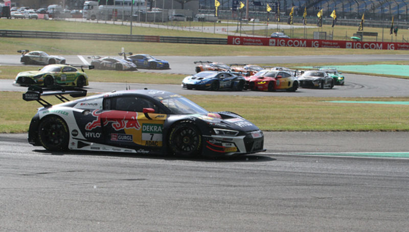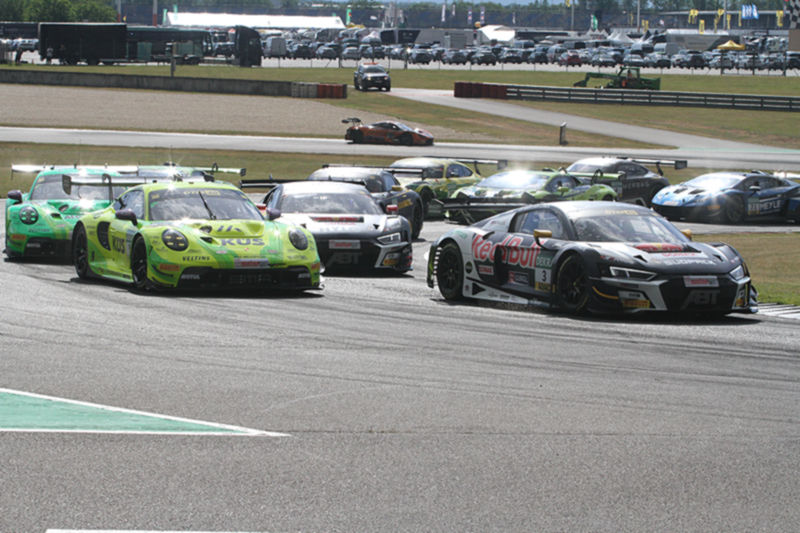 Sonntagmittag um 13.30 Uhr ging es zunächst für die Piloten in die Einführungsrunde. Den besten fliegenden Start erwischte der Pole-Setter Thomas Preining. Er konnte die Meute auch direkt in die erste Kurve führen. Unterdessen hatte Kelvin van der Linde Mirko Bortolotti bereits niedergerungen., Nicki Thiim erhielt eine Penaltylap wegen Frühstarts. Nach der ersten Runde führte weiterhin Thomas Preining mit 0,622 Sekunden vor Ricardo Feller und Kelvin van der Linde. Im Verlauf der vierten Runde griff der Schweizer den Pole Setter vor der ersten Kurve an. Nebeneinander ging es durch diese hindurch. Am Ende konnte sich Ricardo Feller behaupten und übernahm die Führung. Fast zur gleichen Zeit stand Clemens Schmid im Kiesbett. Sofort schickte die Rennleitung das Safety Car hinaus.