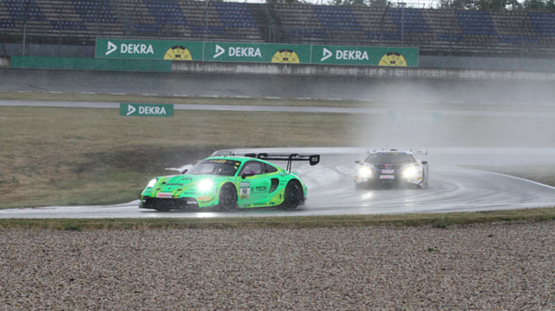 Als das zweite freie Training auf dem Zeitplan stand, hatte sich das Wetter verschlechtert. Es war nämlich am regnen. Diese Sitzung verzögerte sich dann um zwei Minuten wegen nicht abfließenden Regenwassers in einigen Streckenteilen. Um 15.58 Uhr ging es dann endlich los. Im nach hinein wurde die Session dann aber um 16.07 Uhr mit der roten Flagge zunächst wegen zu starkem Regen unterbrochen. Es stand noch eine Restfahrzeit von 36:01 Minuten auf der Uhr. Der Re-Start zum zweiten freien Training erfolgt dann um 16.20 Uhr. Als diese Session beendet war, war Ayhancan Güven mit seinem Porsche von Manthey EMA am besten mit den Wetterbedingungen zurecht gekommen. Er war nach 20 Runden mit einer Zeit von 1:35,573 Minuten der schnellste Pilot im Feld. Rang zwei und drei nahmen Kelvin van der Linde mit seinem Mercedes und Jack Aitken auf seinem Ferrari ein. Thomas Preining und Maro Engel lagen auf den Rängen elf und acht. Luca Engstler hatte sich verbessern können und platzierte sich auf Rang zehn. Hingegen war Luca Stolz bis auf Platz 18 zurückgefallen.