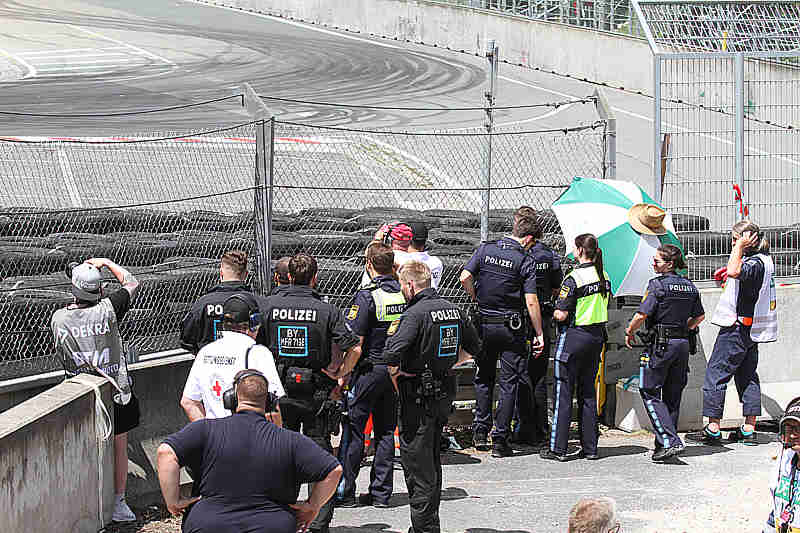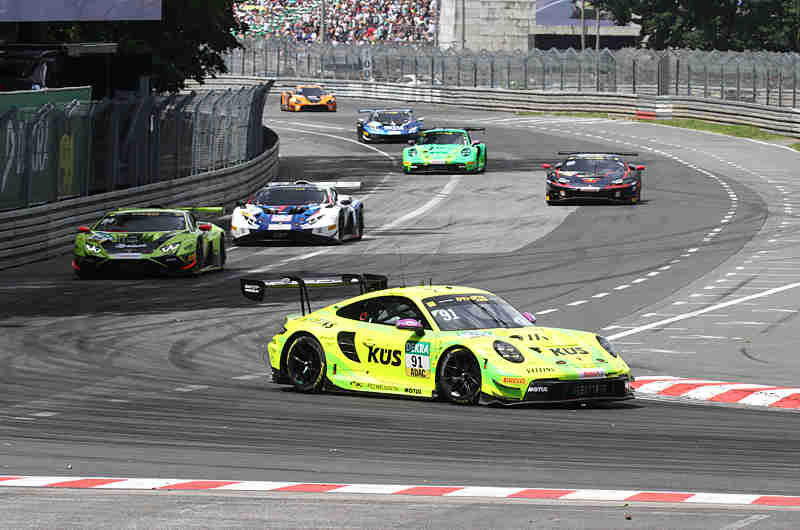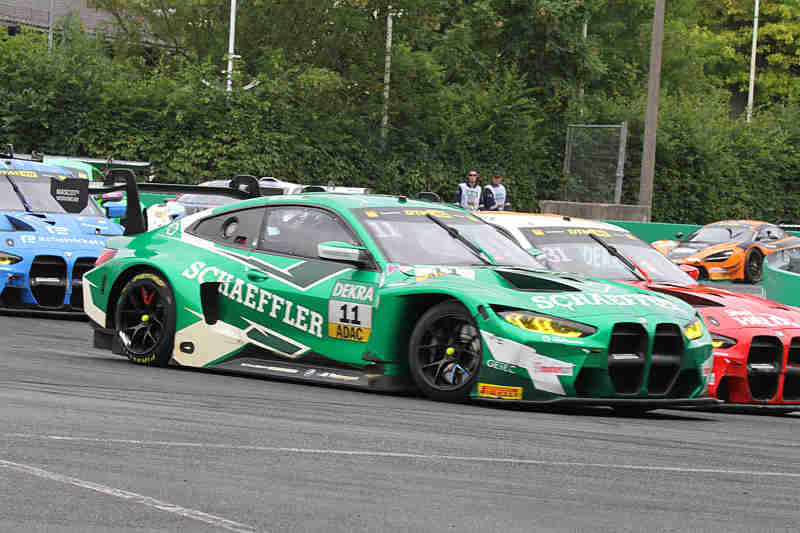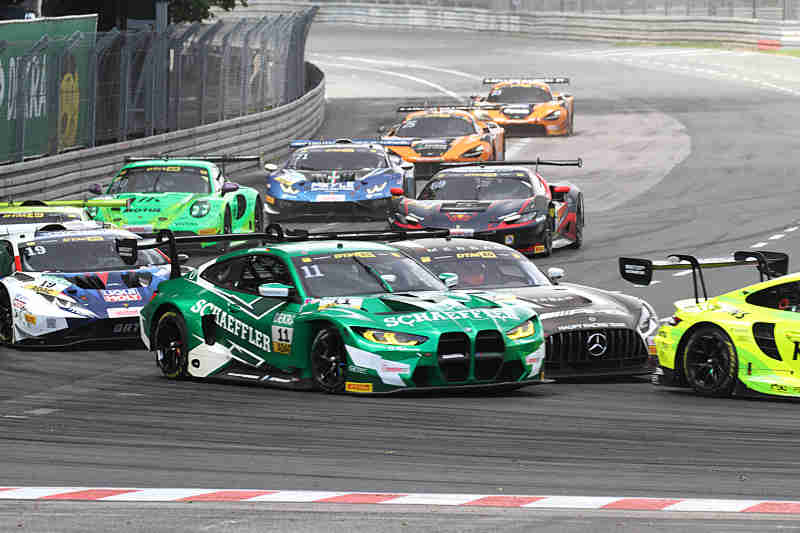 Die Slicks griffen noch gut, da der Boden sehr warm war und die Nässe verdünstete. Aber wie sollte es ausgehen, wenn der Regen mehr würde. Marco Wittmann hatte sich seinen BMW im Frontbereich rechts nach einer Berührung beschädigt. Nach 52 Runden kamen Maro Engel, Arjun Maini, Marco Wittmann und Ricardo Feller herein und holten sich Regenreifen. Die Rundenzeiten wurden nun auch langsamer. Jack Aitken, Kelvin van der Linde, Luca Stolz, Thomas Preining, Sheldon van der Linde und Nicki Thiim zogen auch Regenreifen auf. Denn es schüttete und die Strecke war nun richtig nass. Rene Rast und Franck Perera auf den Plätzen eins und zwei waren immer noch auf Slicks unterwegs. In den letzten zehn Minuten hörte es auf zu regnen und damit begann die Strecke wieder abzutrocknen. Zwei Minuten später fing es erneut an zu regnen. Es regnete in der Grundigkehre und in der Dutzendteichkehre war es fast trocken.