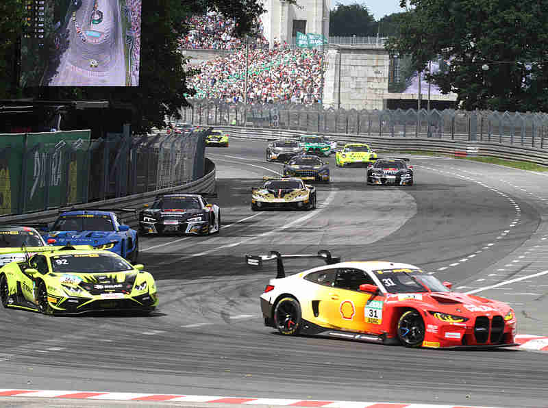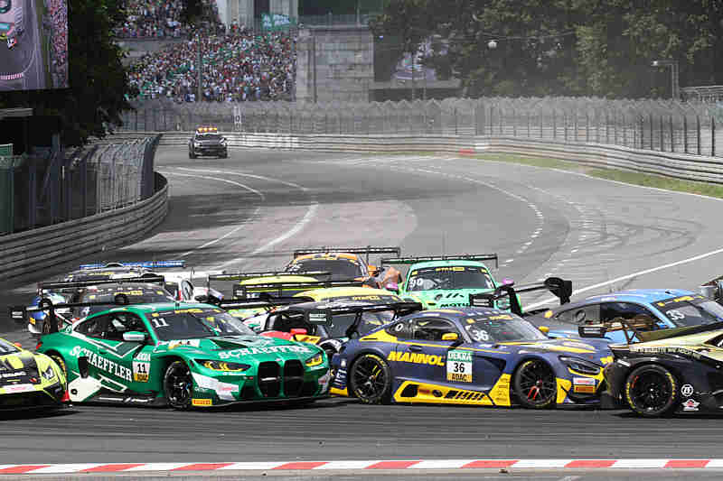 Nach den zwei Einführungsrunden funktionierte der fliegende Start zum siebten Rennen ohne weiteres und Jack Aitken konnte seine Position behaupten und führte die Meute in die Grundigkehre. Nach der ersten Runde führte weiterhin der Pole-Setter vor Sheldon van der Linde und Mirko Bortolotti. Kelvin van der Linde hatte sich schon auf Rang vier gefahren. Maro Engel war wegen eines Reifenschadens hinten rechts in die Box gekommen. Zuvor hatte er sich mit Rene Rast gekebbelt. Franck Perera auf Platz sieben führte eine Meute von zwölf Fahrzeugen an. Hier und da im Feld wurde auch schon etwas der Lack ausgetauscht. Der Lokalmatador hatte zwei Plätze verloren und war nur noch auf Rang zwölf unterwegs. Ben Dörr war unterdessen in die Box gekommen und gab das Rennen schon sehr früh auf.