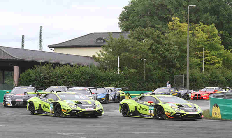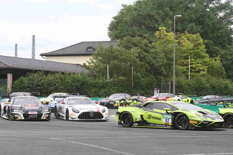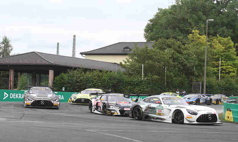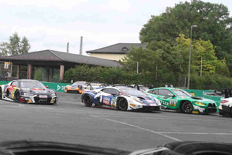 Der sonntägige fliegende Start nach der zweiten Einführungsrunde ging zu Gunsten von Nicki Thiim aus. In der Grundigkehre rumpelte es im hinteren Bereich schon etwas. Nach der ersten Runde führte weiterhin Nicki Thiim vor Mirko Bortolotti und Maro Engel. Rene Rast hatte unterdessen sich schon auf Rang 16 gefahren. Er war von hinten gestartet. Der Pole-Setter hatte sich einen kleinen Vorsprung erarbeitet, denn Mirko Bortolotti wurde von Maro Engel beschäftigt. Maximilian Paul lag unter Beobachtung wegen eines Fehlstarts. Rene Rast war auf einer Aufholjagd unterwegs. Er war schon auf Rang dreizehn vorgefahren und lauerte auf die Chance an Marco Wittmann vorbei zu gehen. Franck Perera erhielt eine Penaltylap wegen Verursachens einer Kollision mit Ricardo Feller.