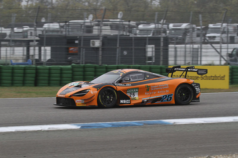 Da die Strecke beim zweiten freien Training am Freitagnachmittag trocken war, konnten sofort schnellere Zeiten gefahren werden. Arjun Maini setzte dann für alle eine Zeit von 1:43,973 Minuten, gefolgt von Thierry Vermeulen und Maro Engel. Zu dieser Zeit waren aber noch nicht alle au der Strecke unterwegs. Mirko Bortolotti war auf Rang sechs unterwegs. An der Spitze wechselten unterdessen immer wieder die Namen. Kelvin van der Linde lag zu dieser Zeit nur auf Rang 17. Luca Engstler auf Rang vierzehn war etwas auf Abwegen unterwegs. Als Sheldon van der Linde auf seine schnelle Runde unterwegs war rutschte er eingangs der Südkurve raus. Er kam auf die lackierten Curbs, die noch nass waren und danach ging es dann ab ins Kiesbett. Er schlug dann noch seitlich in die Reifenstapel ein.