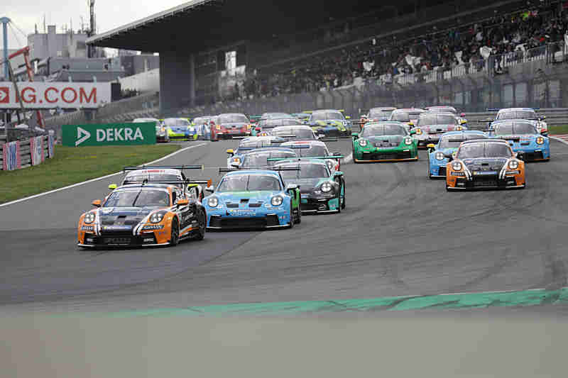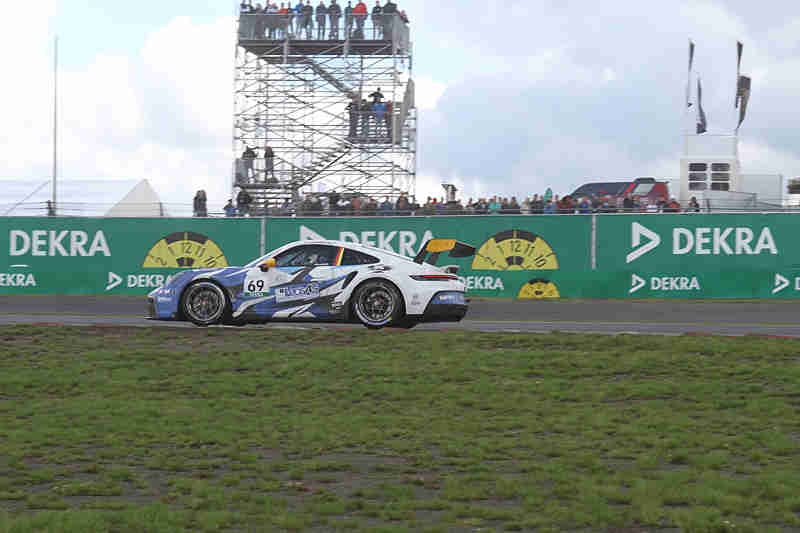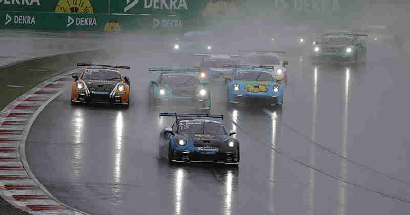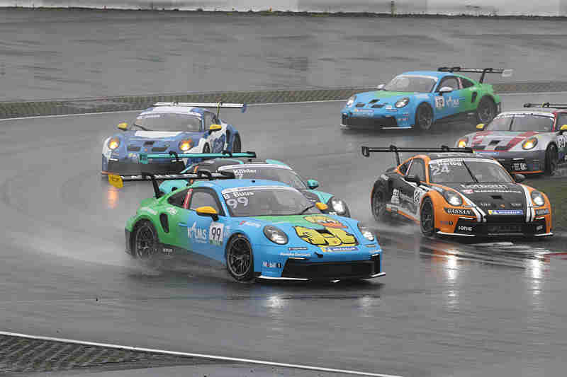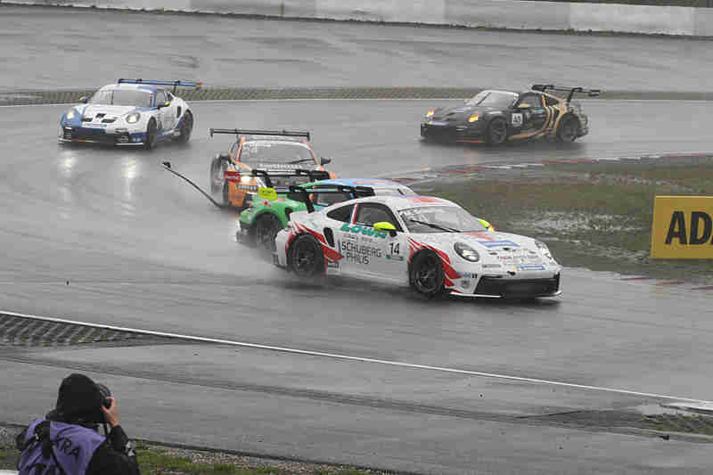 Das sonntägige Rennen am Vormittag fand im strömenden Regen bei einer Außentemperatur von zwölf Grad statt. Nach den zwei Einführungsrunden konnte Larry ten Voorde sich direkt mit zwei, drei Wagenlängen vom Feld absetzen. Bastian Buus erwischte einen schlechten Start. Er war auf Rang vier zurückgefallen. Alexander Tauscher hatte sich auf Platz zwei gefahren. Harri Jones auf Platz sechs war unterdessen der schnellste Rookie im Feld. Nach der ersten Runde musste bereits das Safety Car herauskommen, weil Jonas Greif sich mit seinem Porsche gedreht hatte und ein anderer Kontrahent durch die Gischt nichts sah und in ihn hineinfuhr. Auch Diego Stifter stand mit einem fehlenden vorderen linken Rad neben der Strecke.