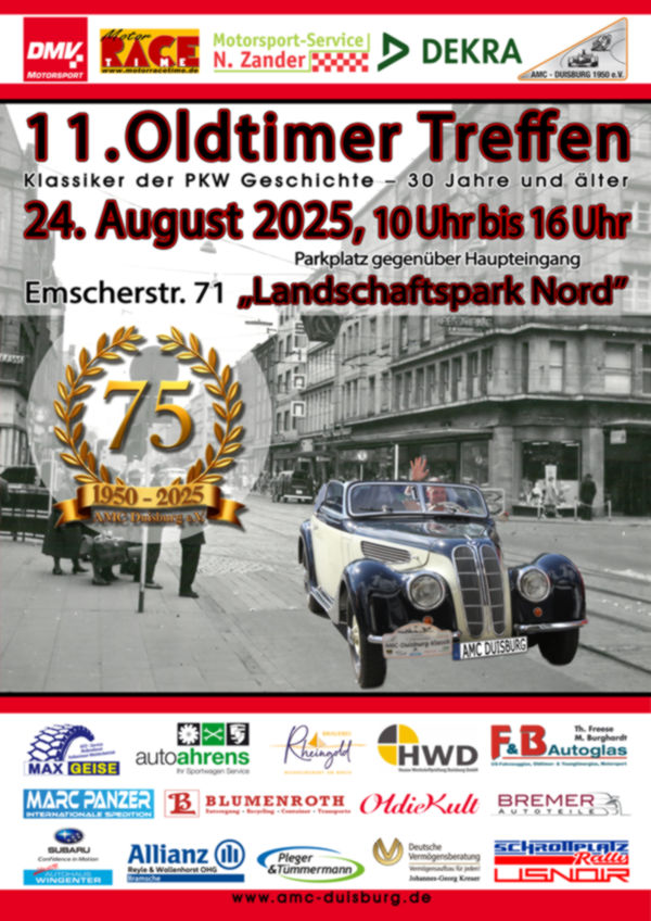 Der AMC Duisburg 1950 e. V. im DMV wird am 24. Augsut 2024 von 10.00 Uhr bis 16.00 Uhr ihr 11. Oldtimer Treffen durchführen. Klassiker der PKW Geschicht von 30 Jahre und äter werden auf denm Parkplatz gegenüber des Haupteinganges vom "Landschaftspark Nord" an der Emscherstraße einfinden.