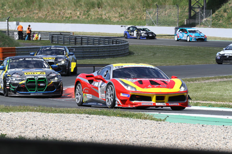 Um genug Temperatur in die Reifen zu bekommen wurde auch beim zweiten Lauf am Sonntagmittag zwei Einführungsrunden gefahren. Danach konnte der Pole-Setter den fliegenden Start für sich nicht verbuchen, denn Henk Thuis konnte noch vor der ersten Kurve die Führung übernehmen. Johannes Kreuer hatte an Boden verloren. Er war nur noch auf dem vorletzten Platz unterwegs. Einen harten Kampf lieferten sich Horst Kespohl/Philipp Stern mit Bastian Hein aus der Division 2. Hier ging es um den dritten Platz. Die Ferrari-Piloten hatten gleich zwei BMW`s im Schlepptau. Zuvor waren sie von Bastian Hein niedergerungen worden. Der Druck von Tudor Tudurachi wurde Runde um Runde immer größer. Dieser bekam aber Druck von seinem Teamkollegen Luca Link.