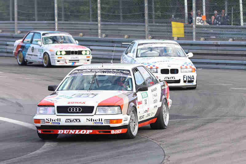 Dass die DTM Classic kein Schaulaufen ist, das haben die Protagonisten der Tourenwagen Legenden im ersten Rennen auf dem Norisring eindrucksvoll unter Beweis gestellt. Zur Freude der Zuschauer ließen es sowohl die Profis von damals, wie Klaus Ludwig, Roland Asch und Marc Hessel, als auch die ambitionierten Amateurrennfahrer, die die legendären Renntourenwagen ihr Eigen nennen, richtig krachen und boten spannende Rennaction auf dem einzigartigen Stadtkurs in Nürnberg. Am Ende jubelte Stefan Rupp mit seinem Audi A4 DTM aus dem Jahr 2007 vor Ronny Scheer im Ford Sierra RS500 (1990) von BWT Mücke Motorsport und Kasper Aaskov im BMW M3 E30 (1991). Wie in den Jahren der ‚alten‘ DTM war an der Spitze Vielfalt angesagt. Roland Asch komplettierte im Mercedes 190 E2.5-16 EVO I den Markenmix an der Spitze.