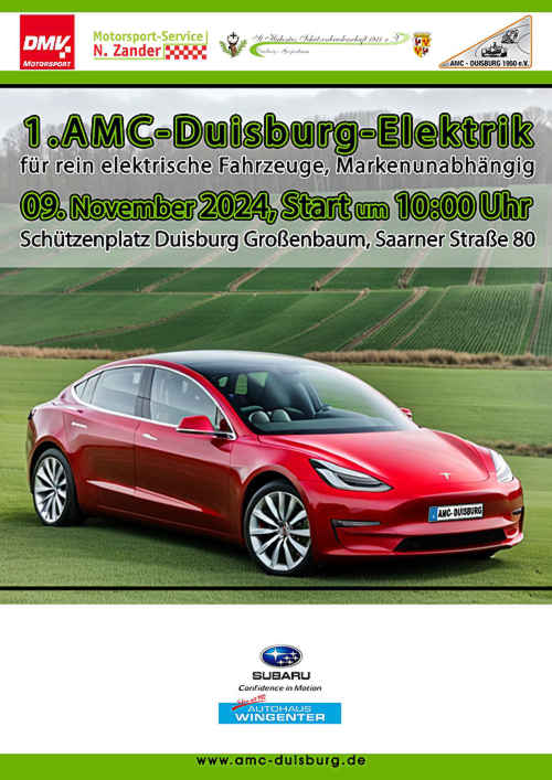 Veranstaltete der AMC Duisburg e. V. im DMV bis dato Oldtimertreffen und Oldtimerrallyes, macht der Verein den ersten Schritt in die Motorsportzukunft. Am 9. November 2024 startet um 10.00 Uhr die 1. AMC – Duisburg – Elektrik. Zugelassen sind rein elektrische Fahrzeuge aller Hersteller. Start und Ziel ist der Schützenplatz der St. Hubertus Schützenbruderschaft 1911e. V in Duisburg Großenbaum, Saarner Straße 80.