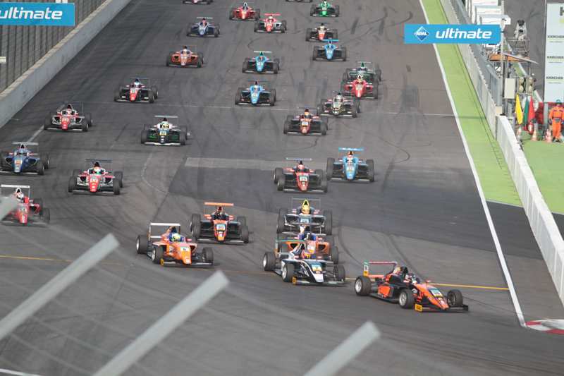 Ihren ersten Lauf an diesem Wochenende nahmen die Fahrerinnen und Fahrer am Samstagmittag unter die Räder. Julian Hanses wurde kurz bevor das Rennen gestartet wurde am Schlepphacken zurück in die Box gebracht. Nach der Einführungsrunde funktionierte der Start dann ohne Probleme und der Pole-Setter konnte seine Position behaupten und führte das Feld in die erste Kure. Mit viel Disziplin ging es hier hindurch. Einen sehr guten Start hatte Jannes Fittje hingelegt. Er konnte sich direkt hinter Mick Schumacher einreihen, wurde dann aber wieder von Kami Laliberte niedergerungen. Wenig später kam es bereits in der ersten Runde zu einer Massenkarambolage und zwar stand plötzlich einer im Mittelfeld quer und die nachfolgenden Fahrer versuchten auszuweichen, es kam dann aber zu einer Kettenreaktion, wobei dann Luca Engstler, Kevin Kratz, Jonathan Aberdein ,Simo Laaksonen, Job van Uitert und Nicklas Nielsen havariert neben der Strecke liegen blieben.
