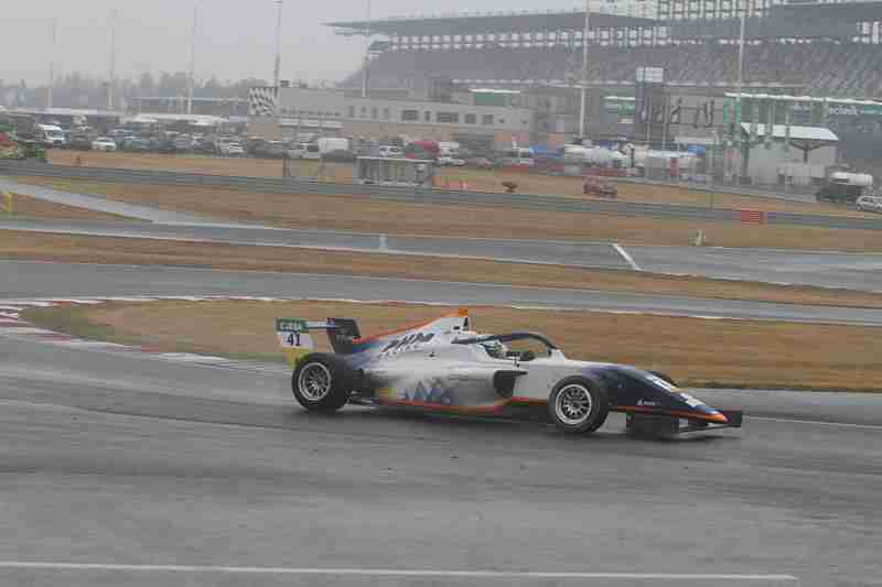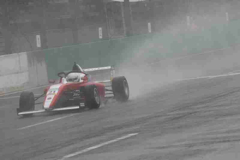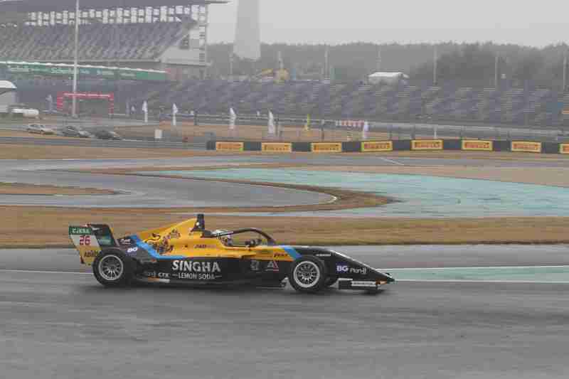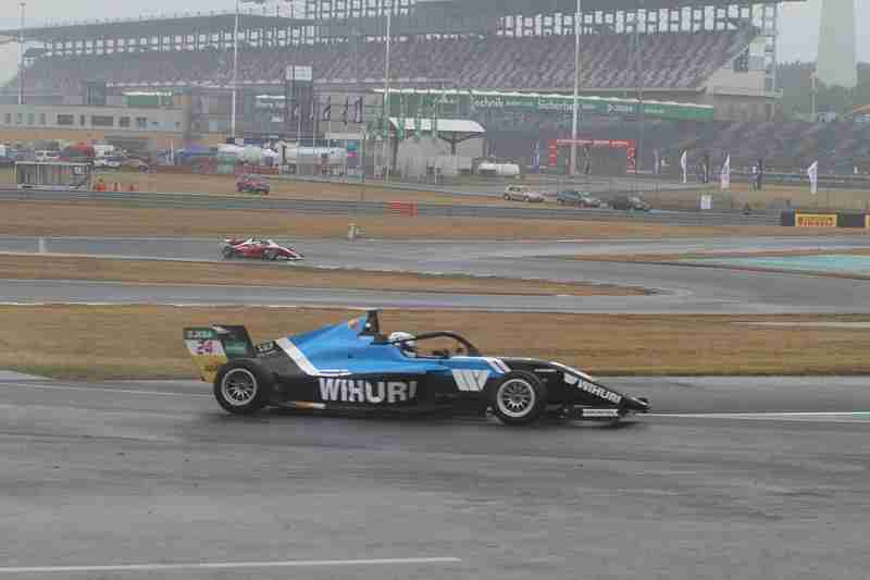 Da die Fahrer bei ihrem ersten Lauf am Samstagvormittag ganz andere Witterungsbedingungen gegenüber gestern vorfanden, denn es hatte immer wieder geregnet und die Strecke nass war, wurde das Rennen als wet race erklärt und es wurden zwei Einführungsrunden gefahren. Bereits in dieser drehte sich Ruiqi Liu von der Strecke. Von Drehern verschont geblieben waren auch nicht Michael Sauter, Kacpar Sztuka und Nandhavud Bihrombhakdi. Valentin Kluss war auch auf Abwegen unterwegs. Er musste am Ende des Feldes dann Platz nehmen. Danach funktionierte der Start nicht ganz ohne Probleme, denn Kacpar Sztuka kam nicht weg und die hinter ihm standen nahmen auch nicht sofort das Rennen auf. Wenig später schoss Jonas Ried in wilden Drifts ins Kiesbett. Valentin Kluss war mit Problemen unterwegs.