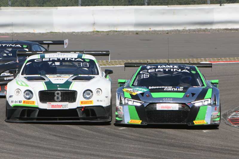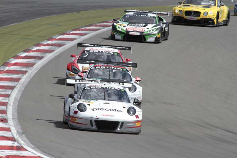 Luca Ludwig/Sebastian Asch hatten bereits acht Plätze gut gemacht und lagen damit auf Rang acht. Zwei Plätze vor ihnen fuhren die Tabellenführer. Unterdessen mussten auch Peter Hovenaars/Frederic Vervisch wegen eines Reifenschadens die Box aufsuchen. Die Tabellenzweiten lagen auf Platz neun und versuchten unterdessen den Anschluss an das Gespann Luca Ludwig/Sebastian Asch zu bekommen. Nach vier Runden musste das Safety Car herauskommen, weil Patrick Kujala/Milos Pavlovic im Kiesbett standen, nachdem sie zuvor von Fabian Hamprecht/Christer Jöns getroffen worden waren. Die Bentley Piloten hatten komplett den Bremspunkt verpasst. Letztere mussten mit einer herunter hängenden Heckschürze und eines kaputten linken Vorderrades die Box aufsuchen. Zwischenzeitlich hatten Remo Lips/Sven Barth einen Dreher zu verzeichnen.