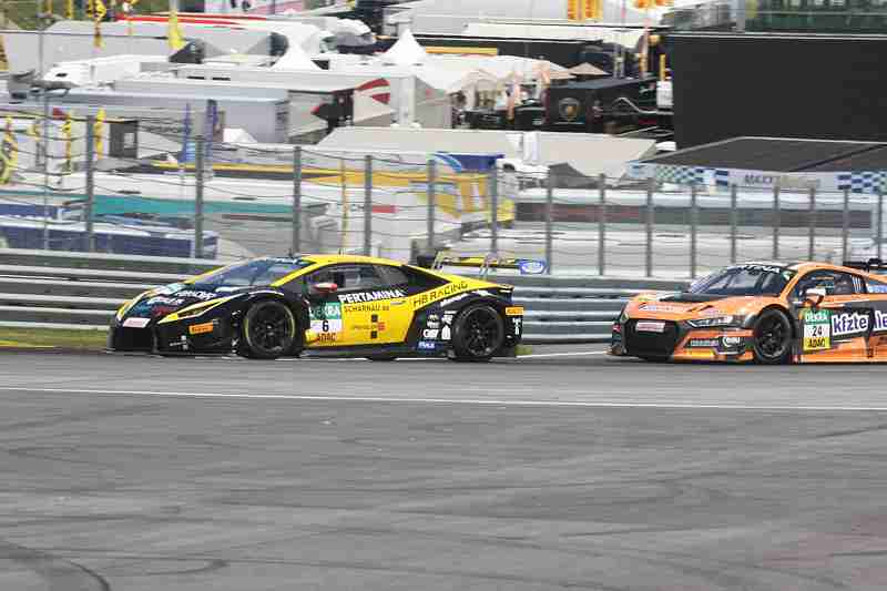 Um Rang 18 war ein harter Kampf entstanden zwischen Christopher Zanella/Florian Spengler, Filip Salaquarda/Markus Winkelhock und Rolf Ineichen/Christian Engelhart. Im gesamten Feld hatten sich Grüppchen gebildet, in denen es mächtig zur Sache ging. Jeffrey Schmidt/Christopher Haase auf Platz sieben hatten nichts zu lachen, denn sie hatten eine Armada von vier Fahrzeugen im Schlepptau. Wenig später mussten sie wegen eines Reifenschadens hinten rechts die Box aufsuchen und eilten nun dem Feld hinterher. An der Spitze konnten Jules Gounon/Daniel Keilwitz sich von ihren Verfolgern Lucas Auer/Sebastian Asch nicht befreien. Diese beiden trennten nur 0,824 Sekunden.