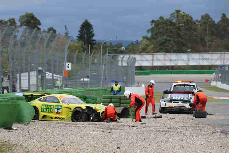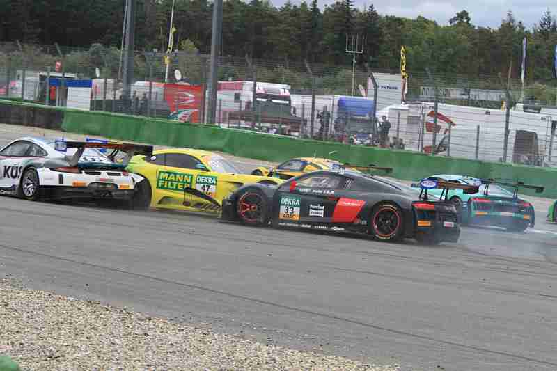 Den vierzehnten Lauf nahmen die Protagonisten am Sonntagmittag bei trockener Strecke unter die Räder. Dries Vanthoor/Florian Spengler hatten gegen die Disqualifikation im Zeittraining Protest eingelegt und somit durften sie das Rennen von Rang zwei aus aufnehmen. Nach der Einführungsrunde konnten Maximilian Götz/Markus Pommer den fliegenden Start nur für kurze Zeit für sich behaupten, denn Dries Vanthoor/Florian Spengler drängten sich innen hinein. Danach kam es zu einer Berührung und die gelbe Mamba drehte sich mit der Folge, dass Frank Stippler/Filip Salaquarda nicht mehr ausweichen konnten und in die Pole-Setter hinein fuhren. Klaus Bachler/Adrien de Leener wollten an beiden vorbeiziehen, wurden von Maximilian Götz/Markus Pommer berührt und schlugen danach heftigst in die Mauer ein. Alle drei blieben havariert neben der Strecke liegen. Die Rennleitung unterbrach das Rennen zunächst mit der roten Flagge.
