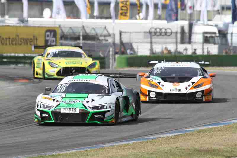 Das Sonntagsrennen in Hockenheim begann turbulent. Pole-Setter Steijn Schothorst/Tim Zimmermann verteidigten zwar in den ersten Kurven die Führung, fielen jedoch im weiteren Verlauf der Startrunde auf Platz fünf zurück. Spitzenreiter war stattdessen Kelvin van der Linde/Patric Niederhauser, die von Startplatz sechs kommend bereits in der Parabolika-Kurve auf Rang drei lagen. Vor der Spitzkehre zogen sie aus dem Windschatten heraus an Markenkollegen Mirko Bortolotti/Rolf Ineichen und Steijn Schothorst/Tim Zimermann vorbei auf Rang eins. Auch Christopher Haase/Max Hofer - von Startplatz vier kommend - zogen noch an ihnen vorbei auf Rang zwei. Danach beruhigte sich das Geschehen auf den Spitzenpositionen.