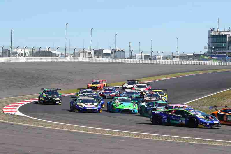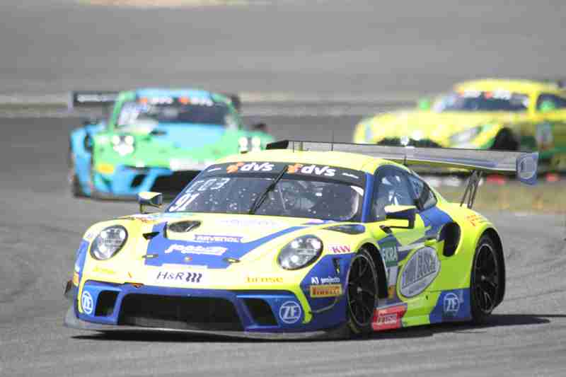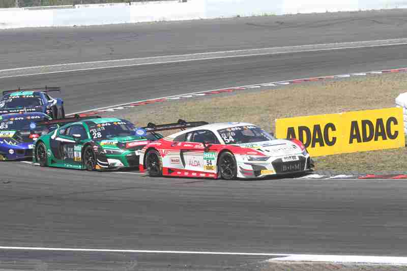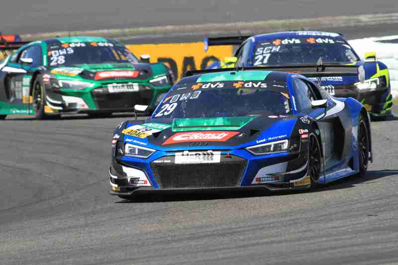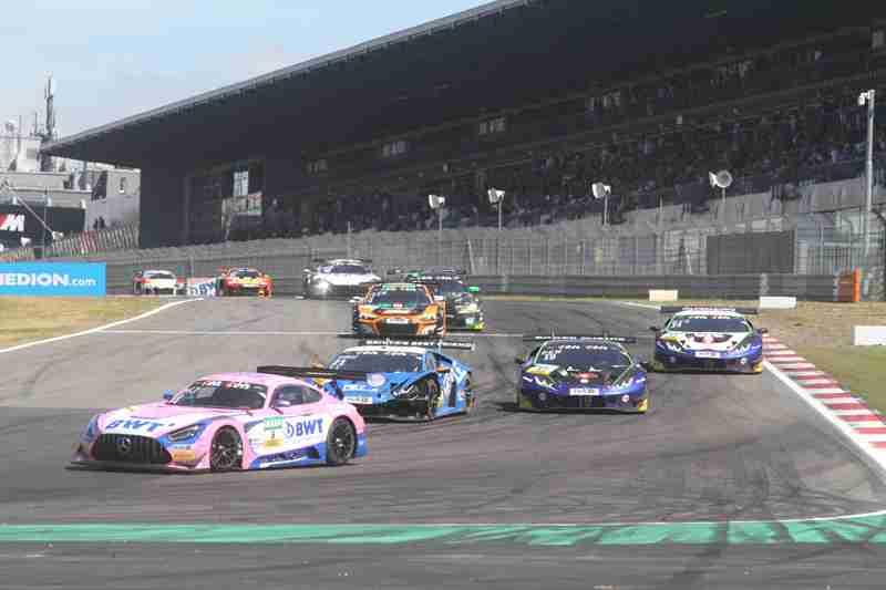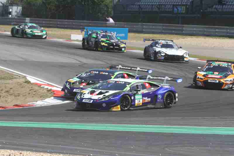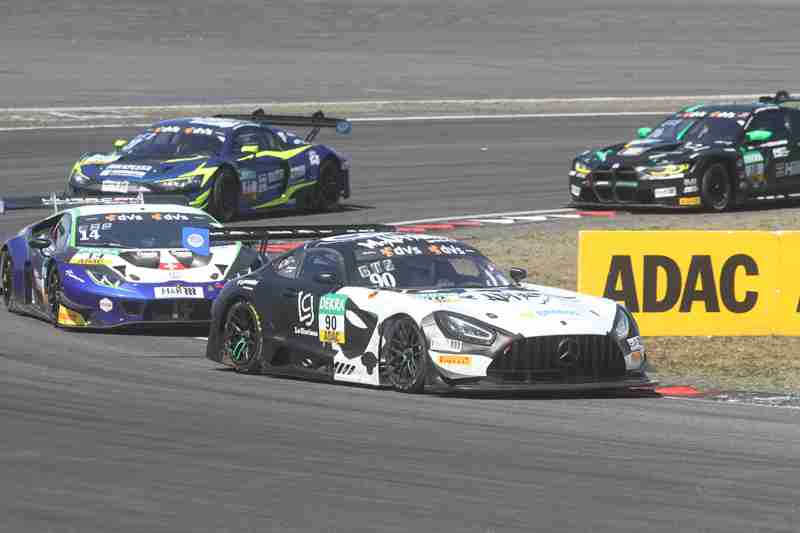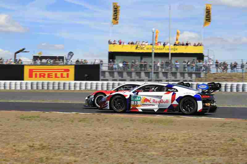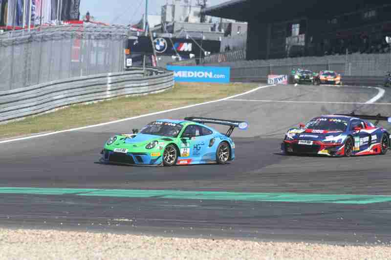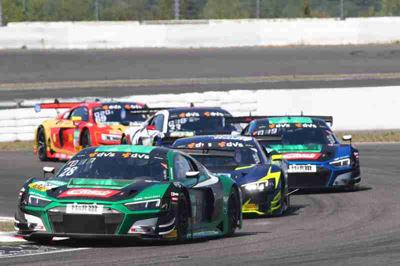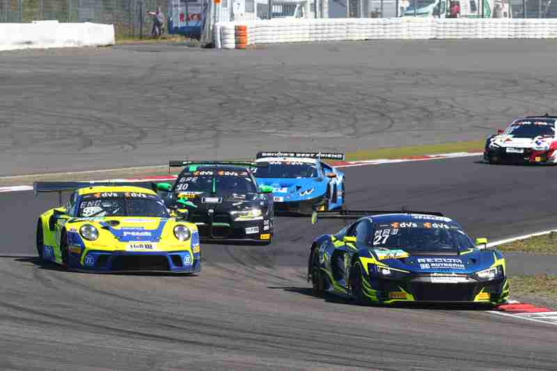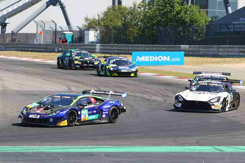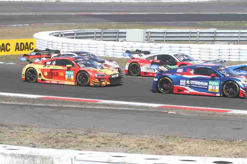 Der fliegende Start zum siebten Lauf in dieser Saison funktionierte am Samstagmittag nach der Einführungsrunde ohne Probleme. Die Piloten der „gelben Mamba“ konnten ihre Position behaupten und führten die Meute in die erste Kurve. Hier ging es mit viel Disziplin hindurch. Wenig später kam es zwischen einigen schon zum Gerangel. Überall wurde hart um jede Position gefightet. Nach der ersten Runde führten weiterhin die Pole-Setter vor Fabian Schiller/Jules Gounon und Ayhancan Güven/Christian Engelhart. Einen Platz gut gemacht hatten Ezequiel Perez Companc/Maximilian Götz. Zu dieser Zeit hatten Simon Reicher/Norbert Siedler einen Dreher zu verzeichnen. Danach durften sie dann dem Feld hinterher eilen. Im Verlauf der dritten Runde waren Kim-Luis Schramm/Dennis Marschall mit einem qualmenden Fahrzeug unterwegs. Zuvor hatten sie von Niklas Krütten/Ben Green einen Treffer bekommen.