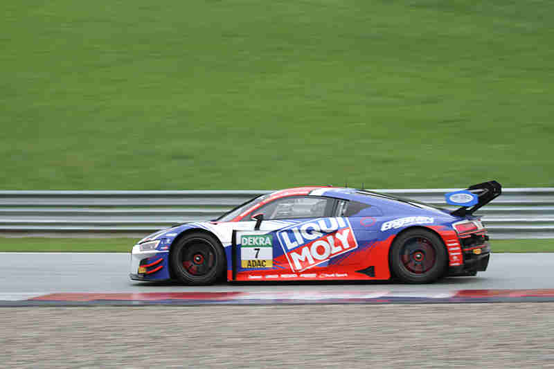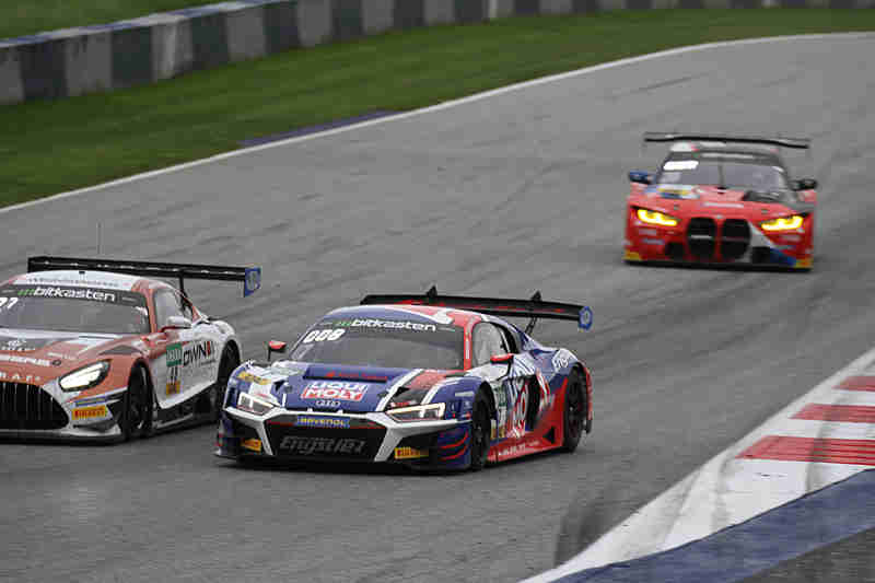 Der Regen wurde nun stärker. Alle die noch mit Slicks unterwegs waren, kamen jetzt in Schwierigkeiten. Nico Menzel/Jannes Fittje waren zurückgefallen und mussten hart um Rang sieben mit John Paul Southern/Jonas Karklys kämpfen. In der siebten Runde hatten Marco Mapelli/ Benjamin Hites alle Hände voll zu tun sich Philip Ellis/Petru Umbrarescu vom Hals zuhalten. Hier ging es um die zweite Position. Beim nächsten Umlauf waren die Lamborghini-Piloten zu weit raus gefahren und sofort konnten die Mercedes-Fahrer und auch noch Sven Müller/Finn Gehrsitz vorbeiziehen. Von alledem bekamen Christian Engelhart/Michael Joos an der Spitze nichts mit, denn sie hatten ihren Vorsprung auf 2,959 Sekunden ausgebaut. Um Rang vier ging es zwischen Marco Mapelli/Benjamin Hites und Ralf Aron/Alain Valente mächtig zur Sache Hier wurde auch der Lack ausgetauscht.