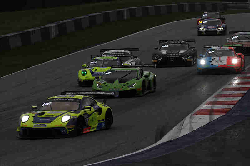 Im nach hinein konnten die Lamborghini-Fahrer ihren vierten Platz nicht verteidigen, denn es gingen Ralf Aron/Alain Valente und auch noch Elias Seppänen/Salman Owega an ihnen vorbei. Damit hatten sie in einer Runde gleich zwei Plätze verloren. In der zwölften Runde hatten sich Elias Seppänen/Salman Owega von Ralf Aron/Alain Valente weit raus schicken lassen. Sie hatten Glück das sie nicht im Kiesbett gestrandet waren. Danach befand man sich nur noch auf Rang sieben wieder. Da Nico Menzel/Jannes Fittje ebenfalls hinaus gedrückt worden waren und durch den Kies mussten, waren sie auf Platz acht zurückgefallen. Ben Green/Eduardo Coseteng waren auf Slicks unterwegs und kamen dann auch etwas von der Strecke. Danach fuhr man auf Rang neun.