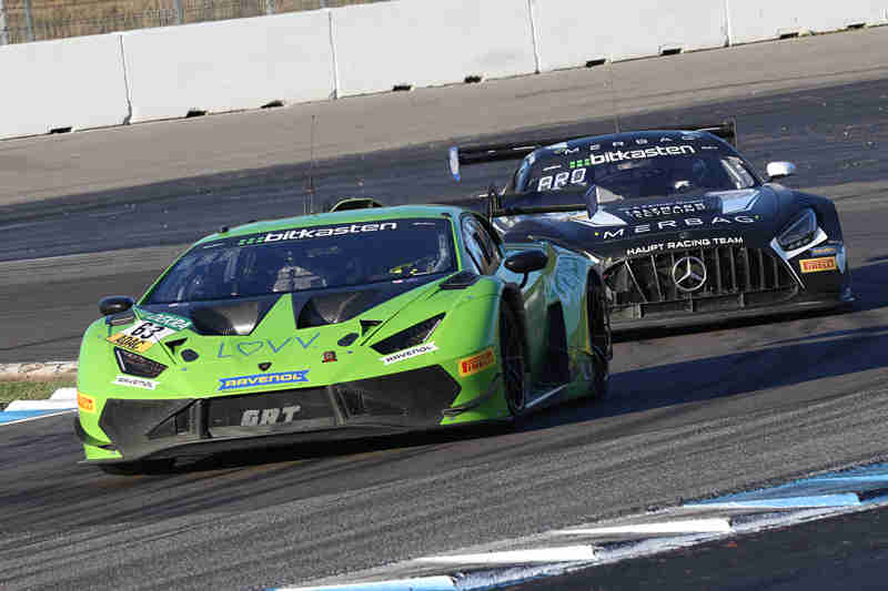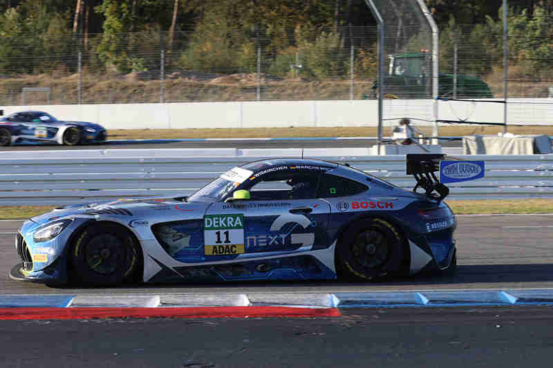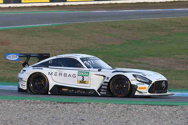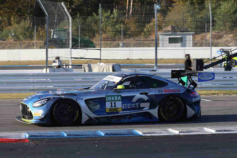 Der große Showdown um den Titel im ADAC GT Masters 2023 fand bei Sonnenschein und Temperaturen von 17 Grad Celsius statt. Nach einer Kollision auf der Start-Ziel-Geraden der 4,574 Kilometer langen Strecke zerplatzten alle Titelhoffnungen von Marco Mapelli/Benjamin Hites schon zu Beginn. Die Lamborghini-Werksfahrer mussten ihr Fahrzeug nach einer starken Beschädigung in der Box abstellen. Nach der anschließenden Safety-Car-Phase bestimmen die Pole-Setter das Tempo und verteidigten ihre Führung. Die Mercedes-Piloten hielten dem Druck von Maximilian Götz/Petru Umbrarescu stand und behaupteten die Spitzenposition.