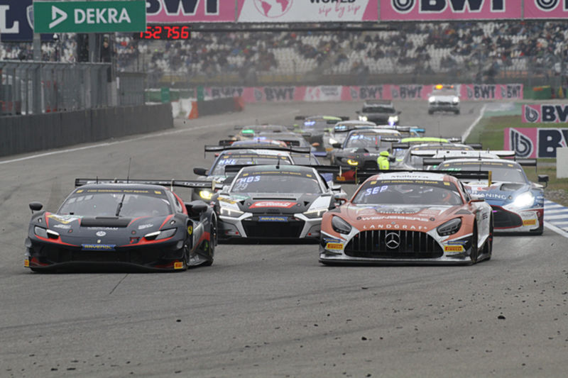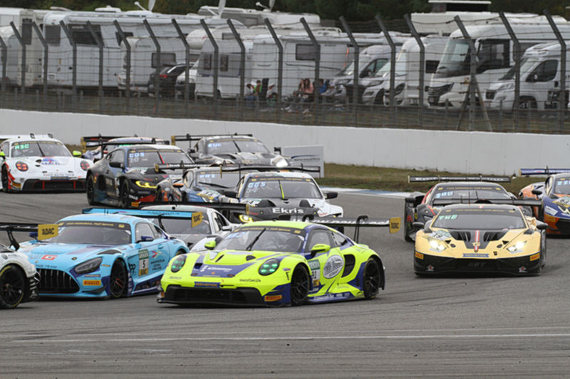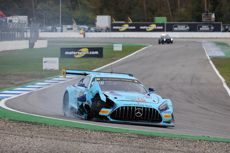 Da die Startampel nicht funktionierte wurde das Rennen durch die Deutsche Nationalflagge frei gegeben. Marcel Marchewicz / Jay Mo Härtling hatten einen guten fliegenden Start nach der Einführungsrunde und konnten die Meute in Führung liegend in die erste Kurve führen. Hier kamen sie alle mit viel Disziplin hindurch. In der Ostkurve waren sich Max Reis / Kwanda Mokoena und Johannes Kapfinger / Michael Kapfinger nicht ganz einig, mit der Folge, dass beide im Aus landeten. Die Zwillingsbrüder waren dort gestrandet. Hingegen waren die Mercedes-Piloten mit einem stark havarierten Fahrzeug im vorderen rechten Bereich unterwegs. Man hatte sich dann in die Box geschleppt und gab dort das Rennen früher auf als geplant. Die Rennleitung hatte unterdessen das Safety Car hinaus geschickt, um den Porsche der Zwillinge in Ruhe bergen zu können.