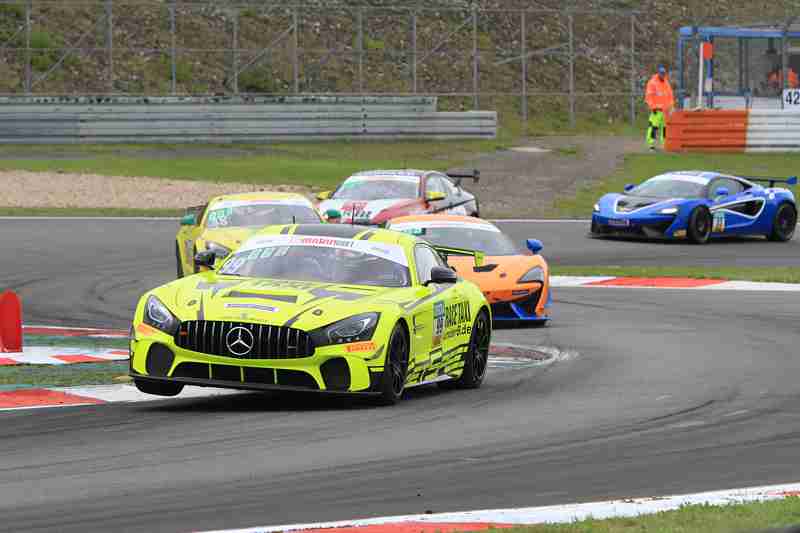 Einen Ausrutscher hatten auch Morgan Haber/Luca-Sandro Trefz zu verzeichnen. Sie kamen aber auf die Strecke wieder zurück und hätten beinahe noch Thomas Jäger/Michael Schrey und Claudia Hürtgen/Michael Fischer abgeräumt. Rang drei hattenunterdessen nun Tim Heinemann/Luke Wankmüller eingenommen. Sie waren von Rang neun aus ins Rennen gegangen. Alain Valente/Felix von der Laden auf Rang sechs gerieten arg unter Druck von Jan Philipp Springob/Oliver Mayer. An der Spitze hatten sich die Mercedes-Piloten ein wenig absetzen können. Nach fünf Runden kam das Safety Car heraus, weil der Reifenstapel nach dem Einschlag der Tabellenführer zu sehr beschädigt war und erst einmal wieder richtig befestigt werden musste.