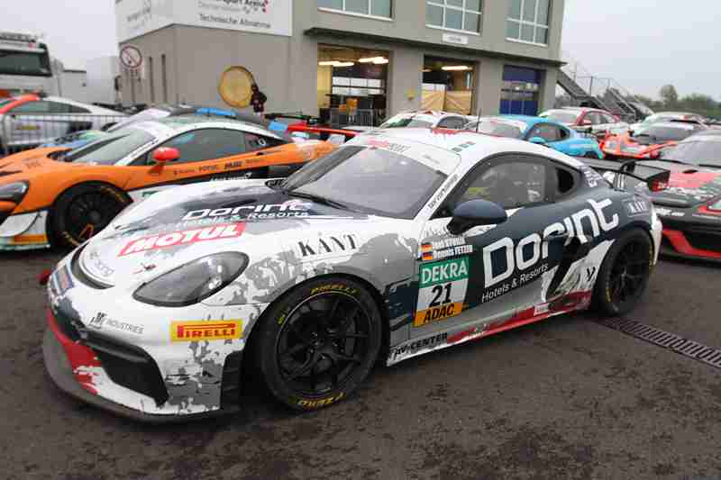 Als letzte Serie am Samstagnachmittag ging die ADAC GT 4 Germany hinaus, um ihren zehnten Lauf in diese Saison hinter sich zu bringen. Bei trockenem Wetter und Sonnenschein ging es dann auf die Strecke. Der fliegende Start funktionierte nach den zwei Einführungsrunden ohne Probleme. Die Pole-Setter konnten ihre Position nicht halten, denn Gabriele Piana/Michael Schrey stachen direkt in eine Lücke und übernahmen in der ersten Kurve die Führung. Florian Janits/Reinhard Kofler hatten sich auf Rang zwei gefahren. Die Pole-Setter lagen auf Platz drei. Nach der ersten Runde versuchten die Führenden sich etwas vom Feld absetzen. Überall im Feld wurden harte aber faire Zweikämpfe ausgetragen.