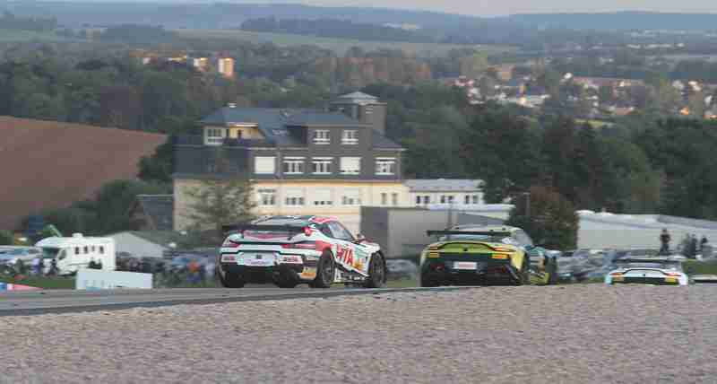 Das Rennen war wegen der Verspätung um zehn Minuten verkürzt worden. Im Verlauf der zehnten Runde mussten Phil Dörr/Indy Dontje absolute Kampflinie gegenüber Vincent Andronaco/Leo Pichler fahren. Die Porsche-Piloten versuchten innen an den Aston Martin Piloten vorbeizugehen. Diese schmissen ihnen aber die Türe vor der Nase zu. Dominik Fugel/Tim Neuer hatten sich zwischenzeitlich nach vorne genommen und auf Platz elf gefahren. Gabriele Pina/Michael Schrey hatten wieder Boden gut machen können und sich auf Platz acht gefahren. In der dreizehnten Runde waren Robert Haub/Theo Nouet und auch Josef Knopp/Reinhard Kofler im Kiesbett gelandet. Sie konnten dieses aber aus eigenen Kräften wieder verlassen. Danach nahmen sie die Plätze 28 und 27 ein.