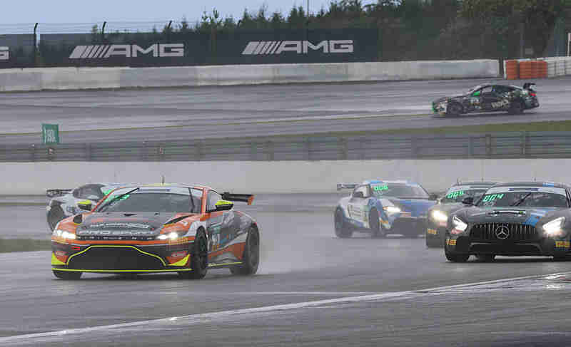 Denis Bulatov/Marcel Lenerz lagen auf Platz sechs. Im Verlauf der sechsten Runde kamen sich Alexander Connor/Emil Gjerdrum und Max Kronberg/Hendrik Still zu nah und beide segelten von der Strecke und schlugen in die Streckenbegrenzung ein. Zuerst wurde Safety Car angezeigt. Im nach hinein brach die Rennleitung dann das Rennen mit rot zunächst ab. Das Safety Car fing das Feld ein und man stellte sich auf der Start und Zielgeraden auf. Zuerst musste die Streckenbegrenzung wieder instand gesetzt werden. Als dies geschehen war konnte der Re-Start nach sechs Runden erfolgen. Die Aston Martin-Piloten konnten sich erneut gegenüber der Konkurrenz behaupten. Unterdessen waren Nicolaj Möller Madsen/Ivan Ekelchik an den Tabellenführern vorbeigegangen und hatten sich somit auf Platz sechs gefahren.