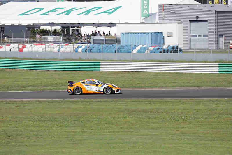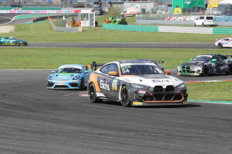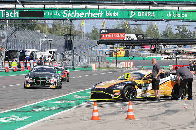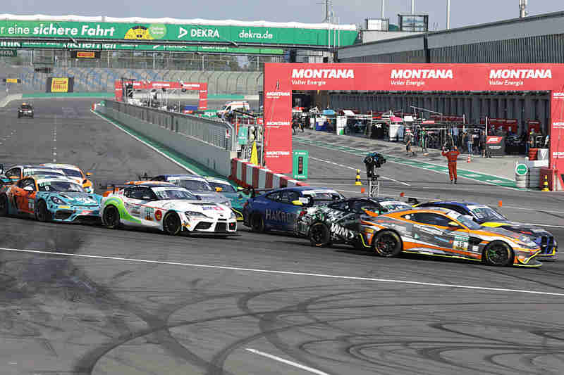Auch der zweite Lauf an diesem Wochenende am Sonntagnachmittag fand bei über 30 Grad statt. Die Pole-Setter konnten ihre Position nach dem fliegenden Start behaupten und bogen als Erste in die erste Kurve. Im hinteren Feld ging es schon zur Sache. Dort wurden Raphael Rennhofer/Leon Erger umgedreht und mussten dann dem Feld hinterher eilen. Dies war aber wegen eines Reifenschadens hinten links nicht möglich. Die Rennleitung schickte das Safety Car hinaus. Nico Hantke/Mex Jensen waren diejenigen, die den Aston Martin getroffen hatten. Sie mussten aber selber nach dieser Aktion die Box aufsuchen. Es führten weiterhin Finn Zulauf/Daniel Gregor vor Denis Bulatov/Marc de Fulgencio und Jannes Fittje/David Jahn.