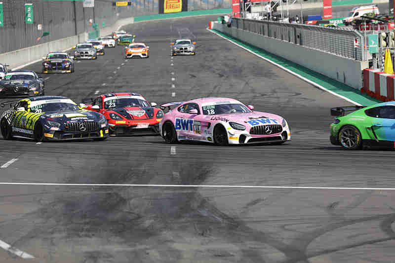 Den ersten Lauf am Samstagnachmittag nahmen die Pilotinnen und Piloten bei über 32 Grad Außentemperatur in Angriff. Die Pole-Setter erwischten nach der Einführungsrunde den besten fliegenden Start und führten die Meute in die erste Kurve. Dort sortierte man sich dann wieder ein und alle kamen gut hindurch. Im gesamten Feld wurde schon hart gefightet. Bereits in der ersten Runde waren sich Patrick Steinmetz/Ferdinand Winter und Stefan Bostandjiev/Pavel Lefterov nicht einig, mit der Folge, dass beide von der Strecke flogen. Die Mercedes-Piloten hatten sich dann aber im Kiesbett eingegraben und sofort musste das Safety Car herauskommen. Die Pole-Setter führten unterdessen immer noch das Feld an, gefolgt von Daniel Gregor/Finn Zulauf und Rodrigo Almeida/Josef Knopp.