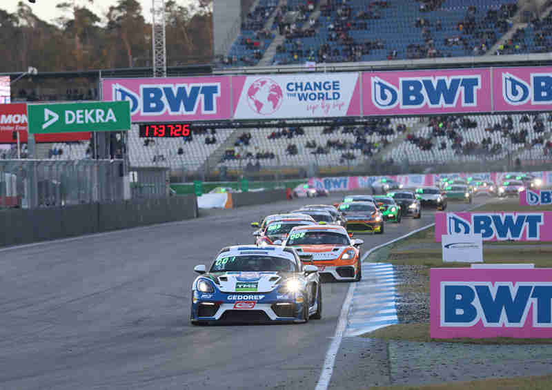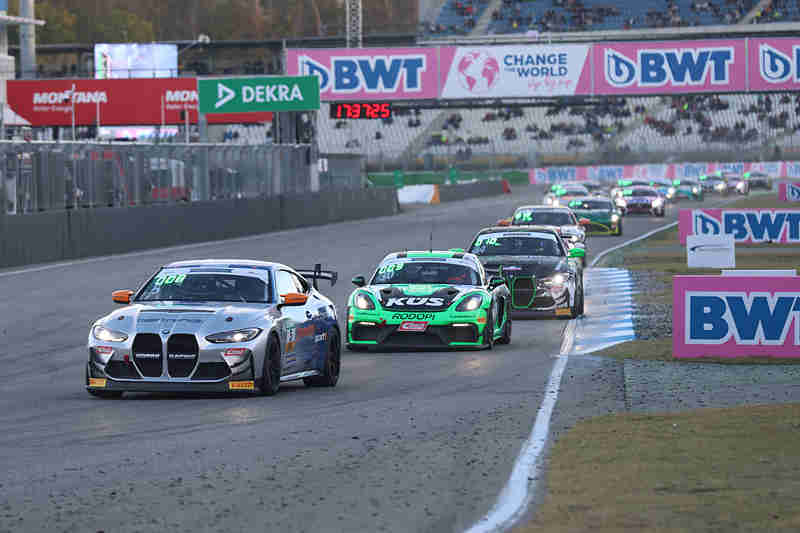 Als letzte Serie achten sich am späten Samstagnachmittag die Fahrerinnen und Fahrer der ADAC GT4 Germany bereit, ihren vorletzten Lauf in diesem Jahr hinter sich zu bringen. Die Pole-Setter konnten nach der Einführungsrunde den fliegenden Start ohne Probleme absolvieren und führten das Feld in die erste Kurve. Aus dem hinteren Feld drehten sich bereits Marat Khayrov/Gabriele Piana hinaus und mussten dem Feld hinterher eilen. Pavel Lefterov/Stefan Bostandjiev lagen unter Beobachtung wegen eines Frühstart. Nach der ersten Runde führten weiterhin die amtierenden Meister vor David Jahn/Nicolaj Möller Madsen/Ivan Ekelchik und Pavel Lefterov/Stefan Bostandjiev. Alexander Hartvig/Nathan Schaap hatten in der Anfangsphase einen Treffer erhalten und waren ans Ende des Feldes zurück gefallen.