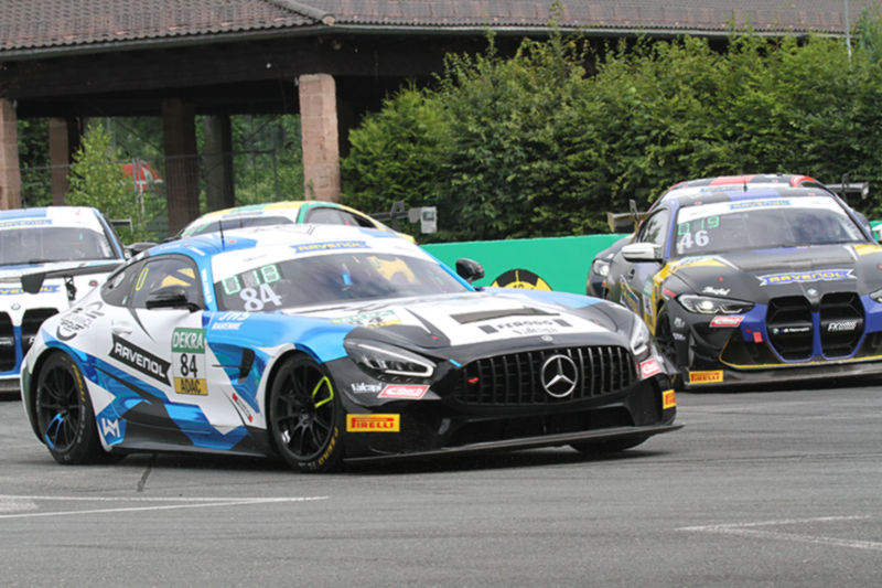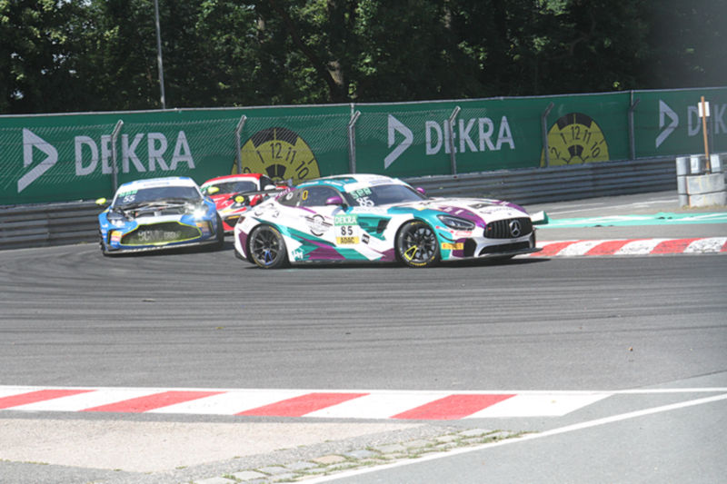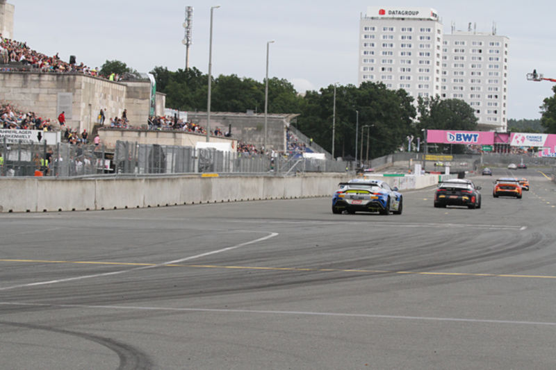 Nach den zwei Einführungsrunden ging es dann zum zweiten Lauf an diesem Wochenende ohne Probleme los. Die Pole-Setter konnten ihre Platzierung behaupten und führten die Meute in die Grundigkehre. Dort wurde hier und dort auch schon ein wenig der Lack ausgetauscht. Nach der ersten Runde führten weiterhin Finn Zulauf / Josef Knopp vor Hendrik Still /Max Kronberg und Alon Gabbay / Tano Neumann. Michael Schrey / Gabriele Piana hatten sich bereits auf Platz sechs gefahren. Im Verlauf der zweiten Runde waren sich Enzo Jouliè /Marc de Fulgencio und Philip Wiskirchen / Markus Eichele nicht ganz einig, mit der Folge, dass der Mercedes stark havariert liegen blieb. Es musste nun das Safety Car heraus kommen. Philip Wiskirchen / Markus Eichele konnten noch bis zur Box kommen um dort das Rennen aufzugeben.