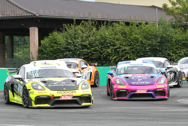 Der fünfte Lauf nahmen die Piloten am Samstagvormittag bei strahlend blauem Himmel und 26 Grad Außentemperatur in Angriff. Nach den zwei Einführungsrunden funktionierte der Start ohne Probleme und die Pole-Setter konnten ihre Position verteidigen und bogen auch als Erste in die Grundigkehre. Mit viel Disziplin ging es dort hindurch. Überall im Feld waren bereits harte aber faire Zweikämpfe im Gange. Um Platz drei mussten Max Kronberg / Hendrik Still sich harten Duellen gegenüber Ivan Ekelich / Ferdinand Winter erwehren. Im nach hinein konnten dann die Porsche Piloten von Wimmer Werk Motorsport vorbei gehen. Gabriele Piana / Michael Schrey führten an der Spitze bereits mit einem Vorsprung von 1,455 Sekunden. Simon Birch / Denny Berndt auf Rang zwei hatten gleich sechs Fahrzeuge im Schlepptau. Danach riss das Feld ein wenig ab.