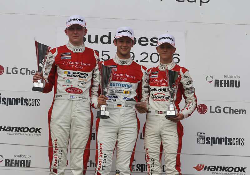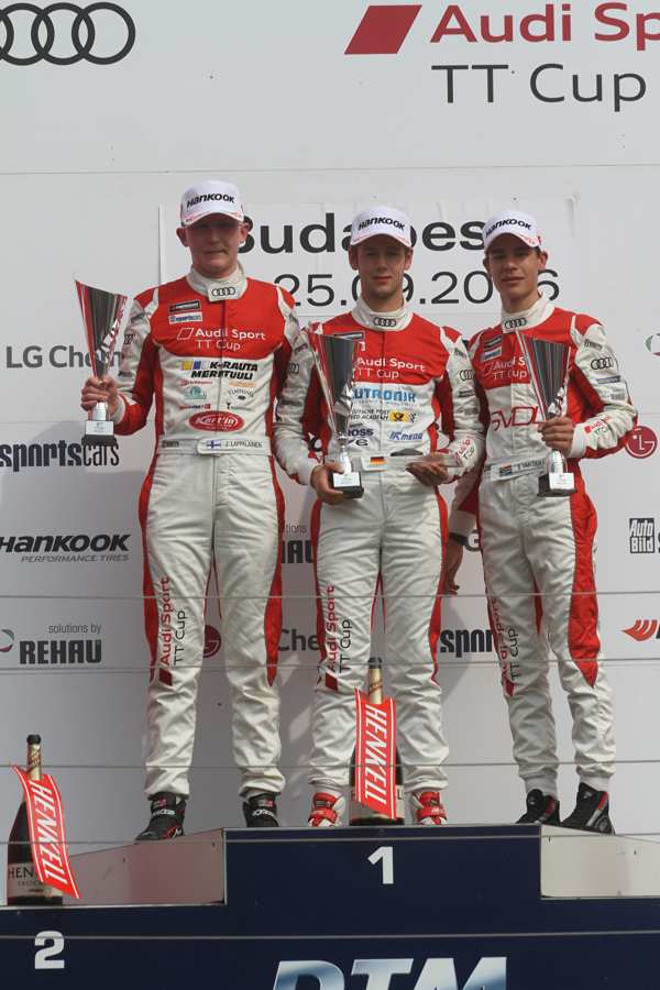 Der Audi Sport TT Cup 2016 ist auf der Zielgeraden. Beim vorletzten Rennwochenende der Saison kann sich Joonas Lappalainen vorzeitig zum neuen Champion küren. Der 18-jährige Finne hat nach seinen beiden Siegen auf dem Nürburgring 197 Zähler und damit 17 Punkte Vorsprung auf den Zweitplatzierten Dennis Marschall (180). Auch der Däne Nicklas Nielsen und Sheldon van der Linde aus Südafrika haben mit 166 respektive 163 Zählern noch realistische Chancen, Nachfolger von Jan Kisiel zu werden. Der Pole setzte sich im vergangenen Jahr die Krone im Audi Sport TT Cup auf.