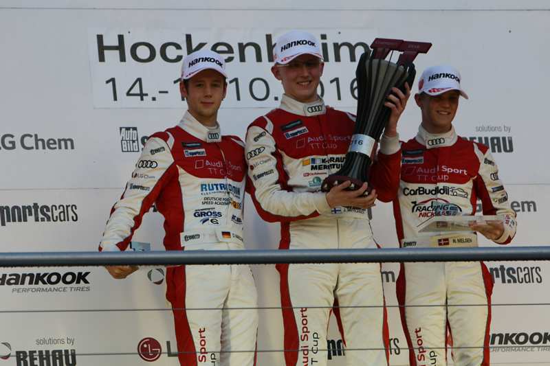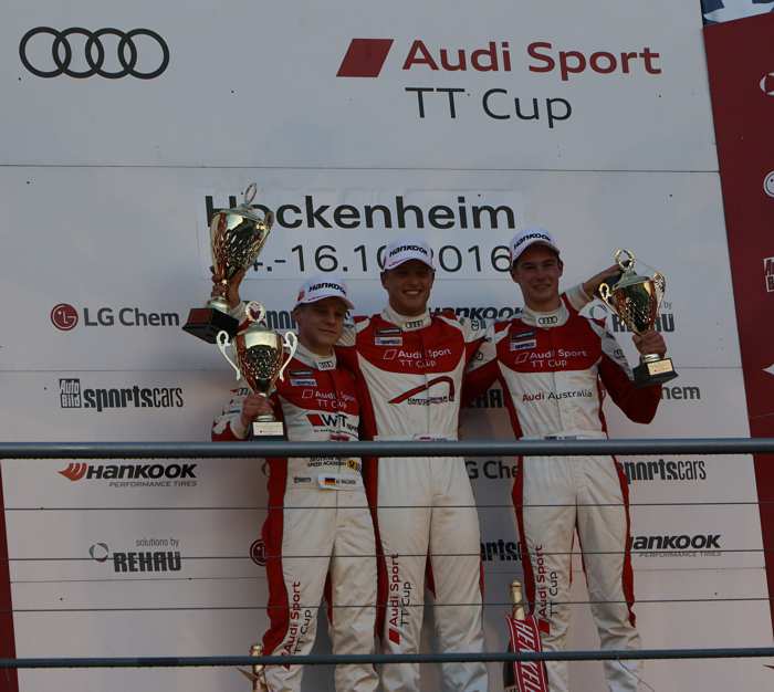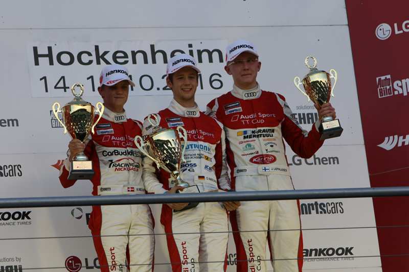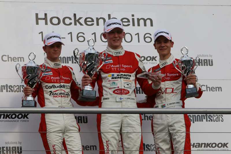 In der Gesamtwertung liegt der 18-jährige Joonas Lappalainen aus Finnland vor den letzten beiden Rennen mit 239 Punkten an der Spitze. Dennis Marschall folgt mit neun Zählern Rückstand auf Rang zwei. Auch der Südafrikaner Sheldon van der Linde (197 Punkte) und der Däne Nicklas Nielsen (196 Punkte) hegen bei maximal 50 zu vergebenden Zählern noch Ambitionen auf den Gesamtsieg. Van der Linde und Nielsen kämpfen auch um den Titel des besten Rookies. „Die zweite Saison im Audi Sport TT Cup hat nahtlos an das Premierenjahr angeknüpft“, sagt Projektleiter Philipp Mondelaers. „Unsere Talente haben den vielen Fans an den Strecken, am Fernseher und im Livestream super Motorsport geboten. Bei dem aktuellen Punktestand garantiere ich unseren Fans ein packendes Finale.“