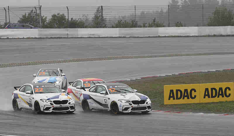 Als die Pilotinnen und Piloten ihren fünften Saisonlauf am Samstagnachmittag unter die Räder nahmen, war das mit dem Wetter so eine Sache, denn mal war es trocken und dann fing es wieder an zu regnen. Nachdem man im Auto Platz genommen hatte, war die Ideallinie fast schon wieder trocken. Man startete aber trotzdem auf Regenreifen. Nach den zwei Einführungsrunden funktionierte der Start ohne Probleme und der Pole-Setter konnte sich behaupten. Weit gefächert ging es auf die erste Kurve zu. Max Rosam hatte sich bereits auf Rang zwei geschoben. Colin Bönighausen nahm nur noch Platz vier ein. Wenig später drehte sich der Tabellenführer und musste danach dem Feld hinterher eilen. Überall wurden harte Zweikämpfe ausgetragen.