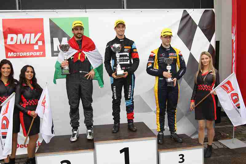 Zu Mercedes-Pilot Heyer gesellten sich bei der Gesamtsiegerehrung Kim-Luis Schramm und Simon Reicher, (beide Audi R8 LMS GT3). 18 Rennrunden durfte die Spitze des Feldes bestreiten, bevor die Uhr für den auf 30 Minuten angelegten spätnachmittäglichen Sprint abgelaufen war. „Manchmal musst du ein, zwei Wagenlängen zurück sein, um besser einschätzen zu können, wo du vorbei kannst. Ich hab es zweimal in der Spitzkehre probiert, dort habe ich gemerkt, dass die Traktion des zu diesem Zeitpunkt vor mir liegenden Car Collection-Audis etwas besser ist, dann hab ich mir eine andere Stelle überlegt und das hat dann ja Gott sei Dank auch geklappt“, freute sich Kenneth Heyer über eine weitere Ehrung am Final-Wochenende. Nicht ganz zufrieden zeigte sich Simon Reicher im Siegerinterview mit seiner Leistung: „Die Performance des Autos war nicht da, so dass einfach nicht mehr drin war heute.“
