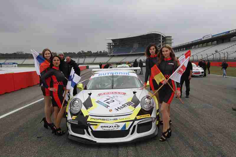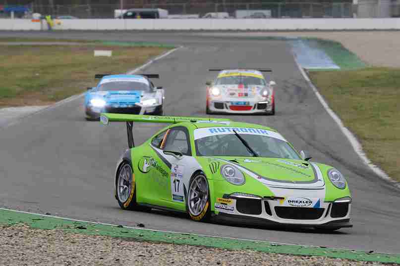 Michael Joos, ursprünglich von Platz 9 gestartet, profitierte vom Ausfall eines Wagens in der Startreihe vor ihm. „Als Gaststarter war das eine relativ kurz entschlossene Sache gestern, mit dem Setup lagen wir eigentlich total daneben, weil wir aus dem Sportscup kommen, dort Michelin fahren und das Auto auf die Dunlops gar nicht eingestellt war“, lachte der strahlende Drittplatzierte. Im ersten Rennen des DMV GTC musste Joos den Porsche nach einer ‚Feindberührung‘ abstellen, konnte den Schaden jedoch rechtzeitig vor der Startaufstellung von seiner Crew beheben lassen.