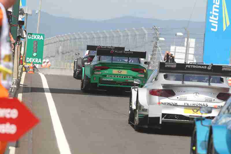 Die Startaufstellung für das Rennen am Sonntagmittag mussten die Fahrer am Vormittag bei hohen Temperaturen ausfahren. Als die Boxenampel auf Grün schaltete gingen sie so nach und nach alle hinaus auf die Strecke. Paul die Resta setzte dann für alle anderen eine Zeit von 1:37,291 Minuten, gefolgt von Lucas Auer und Rene Rast. Zu diesem Zeitpunkt waren vier Piloten noch nicht auf der Strecke. Sie warteten erst einmal ab. Bei noch neun Minuten zu fahrender Zeit waren alle draußen gewesen und kamen nun zurück in ihre Garagen. Zu dieser Zeit hatte Timo Glock mit einer Zeit von 1:37,283 Minuten das Zepter übernommen. Platz zwei und drei nahmen Paul di Resta und Jamie Green ein. Der Tabellenführer lag unterdessen nur auf Rang 15.
