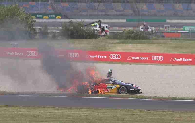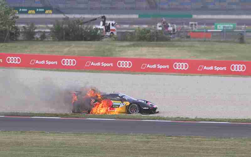 Zwei Minuten später waren dann alle wieder auf der Strecke und jagten nun der Bestzeit von Nico Müller hinterher. Plötzlich war Felipe Fraga mit seinem brennenden Ferrari unterwegs. Er steuerte diesen sofort ins Kiesbett und konnte von alleine dass Fahrzeug verlassen. Er spurtete zu einem Streckenposten und löschte danach selber mit einigen Streckenposten das Fahrzeug. Die Session wurde mit der roten Flagge unterbrochen. Nachdem das Fahrzeug gelöscht war konnten die Piloten noch einmal für fast vier Minuten wieder auf die Strecke hinaus. In der letzten Minute hatte sich der dreifache Meister Rene Rast auf die Pole geschoben. Doch er wurde im nach hinein von Maro Engel verdrängt. Dieser hatte für alle eine Zeit von 1:31.238 Minuten in den Asphalt gebrannt.