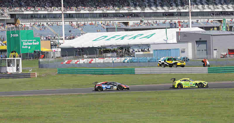 Laurin Heinrich hatte nach zwei Runden das Rennen schon früh beendet. An der Spitze hatten sich die beiden mit über zwei Sekunden vom übrigen Feld abgesetzt. Thomas Preining war weiterhin auf Rang fünf unterwegs. Luca Engstler war von Marco Wittmann niedergerungen worden und lag jetzt auf Platz 17. Unter Beobachtung stand auch Clemens Schmid wegen pushing another car. Clemens Schmid hatte alle Hände voll zu tun Franck Perera und Thomas Preining hinter sich zu halten. Das Boxenzeitfenster öffnete nach 15 Runden. In diesem Moment hatte Clemens Schmid von Franck Perera einen Treffer erhalten. Neun Fahrzeuge holten sich nun neue Reifen. Der Lamborghini von Franck Perera wurde zwischenzeitlich in die Box geschoben. Für ihn hatte sich das Rennen erledigt. Diesen Crash mussten sich die Sportkommissare nach dem Rennen genau anschauen.