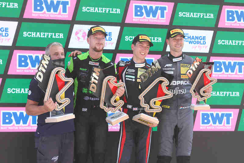 Kelvin van der Linde (Abt Sportsline): „Nach der bisher schwierigen Saison für mich fühlt sich der dritte Platz fast wie ein Sieg an. Das Team hat eine super Strategie für den Boxenstopp gewählt, dadurch konnte ich Lucas Auer überholen und mir endlich den ersten Podiumsplatz der Saison holen. Im Duell um den zweiten Platz war mir klar, dass ich Mirko Bortolotti direkt voll attackieren muss, bevor er seine Reifen ins optimale Temperaturfenster bekommt. Ich habe es überall versucht, leider hat es nicht geklappt.”