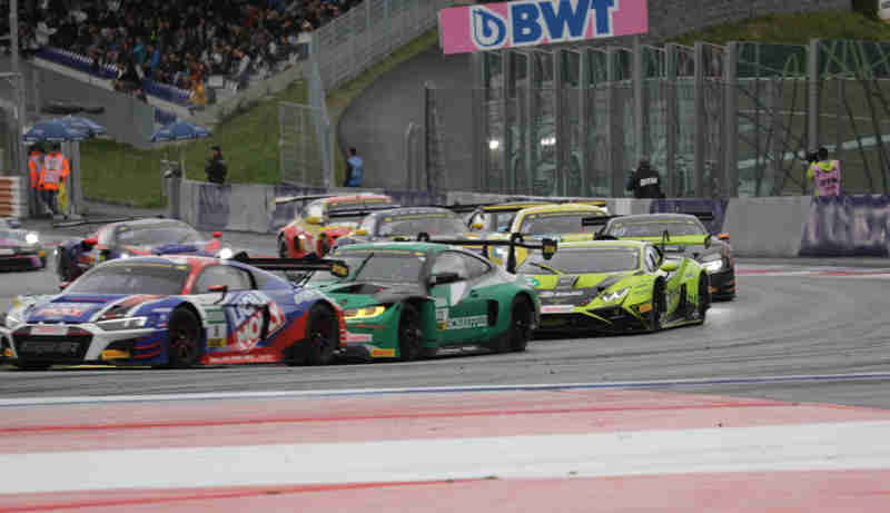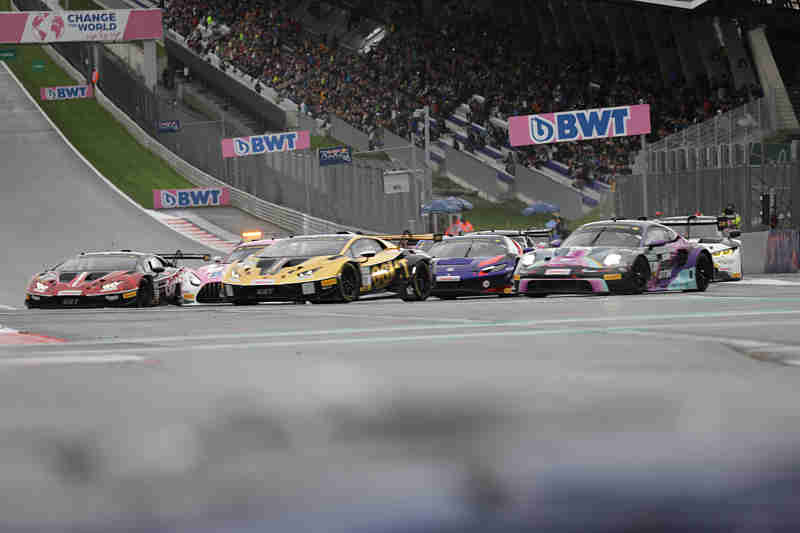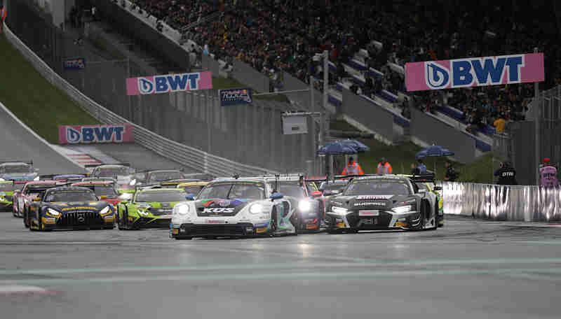 Als die Piloten in ihre Startaufstellung fuhren fing es zunächst leicht an zu regnen. Eine viertel Stunde vor dem Start wurde dieser dann kräftiger. Das Fahrzeug von David Schumacher stand noch nicht in der Startaufstellung, denn man arbeitete noch immer an diesem. Einige der Piloten waren auf Regenreifen, es waren die aus dem hinteren Starterfeld und andere auf Sliks unterwegs. Aufgrund der Witterungsbedingungen wurden zwei Einführungsrunden gefahren. Danach konnte der Pole-Setter den Start für sich verbuchen. Er wurde aber nach der ersten Kurve von Kelvin van der Linde attackiert. Alle die mit Slicks unterwegs waren hatten Probleme. Maro Engel war von Rang sechs gestartet und hatte sich bereits auf Platz drei gefahren und setzte nun den türkischen Pilot unter Druck.