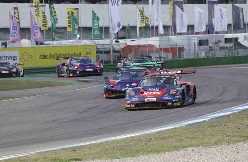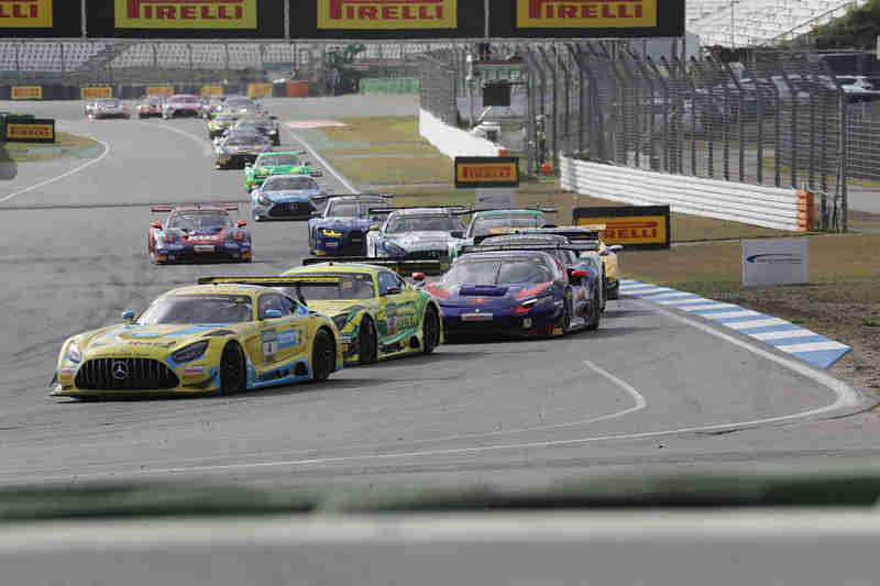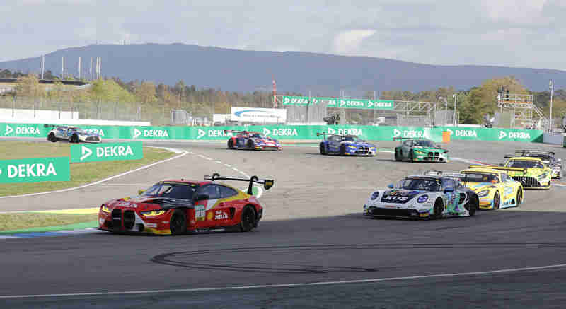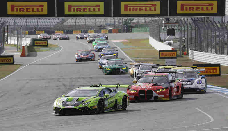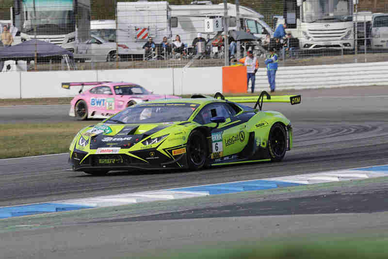 Auch das letzte Rennen in diesem Jahr am Sonntagmittag funktionierte nach der Einführungsrunde ohne Probleme. Thomas Preining konnte den fliegenden Start für sich verbuchen. Durch die erste Ecke kamen sie geordnet hindurch. Sheldon van der Linde hatte Luca stolz vor der Spitzkehre bereits niedergerungen. Hier wurde im hinteren Feld schon mächtig der Lack ausgetauscht. Nach der ersten Runde führte weiterhin der Pole-Setter vor Mirko Bortolotti und Sheldon van der Linde. Im Verlauf der zweiten Runde schenkten die ersten drei sich einmal gar nichts. Ricardo Feller hatte einige Plätze eingebüßt. Er war nur noch auf Rang 17 unterwegs. Kurz vor der Spitzkehre kamen sich Marco Wittmann und Christian Engelhart zu nah mit der Folge, dass der Lamborghini-Fahrer sich drehte und einschlug.