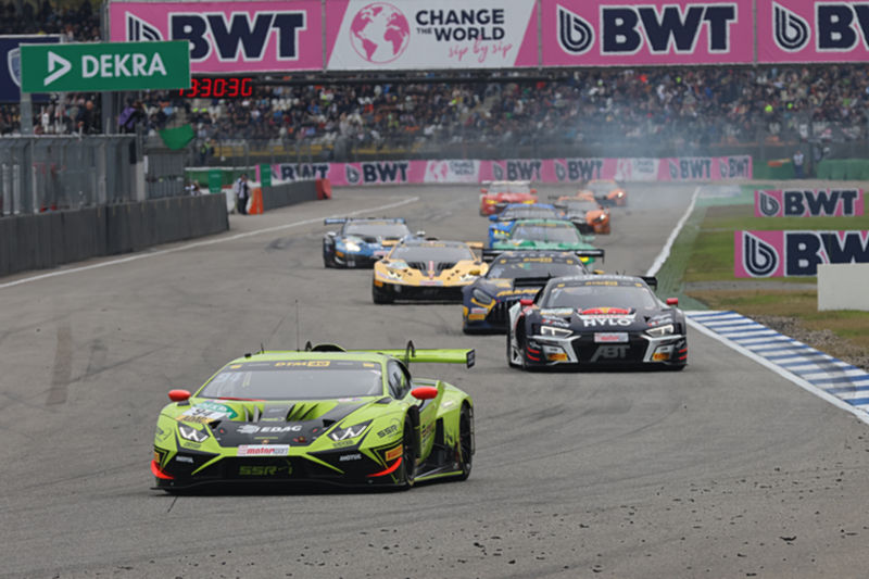 Als die Fahrer am Freitagvormittag ihr erstes freies Training über 55 Minuten in Angriff nehmen wollten, fing es an zu regnen. In der Anfangsphase waren insgesamt acht Piloten auf die Strecke hinaus gegangen. Alle anderen warteten ab. Die Namen an der Spitze wechselten immer wieder. Nachdem dann alle hinausgegangen waren, hatte sich Kelvin van der Linde (Abt Sportsline) mit einer Zeit von 1:48,888 Minuten an die Spitze gefahren. Platz zwei und drei nahmen Mirko Bortolotti (SSR Performance) und Luca Engstler (Lamborghini Team Liqui Moly by GRT) ein. Maro Engel befand sich zu dieser Zeit auf Platz elf. Jules Gounon, der an diesem Wochenende für Luca Stolz (dieser kann aus gesundheitlichen Gründen nicht in Hockenheim dabei sein) ins Lenkrad greift lag auf Platz acht. Es standen noch 35 Minuten auf der Uhr.