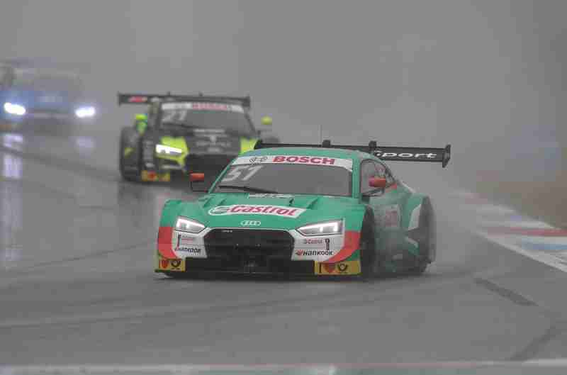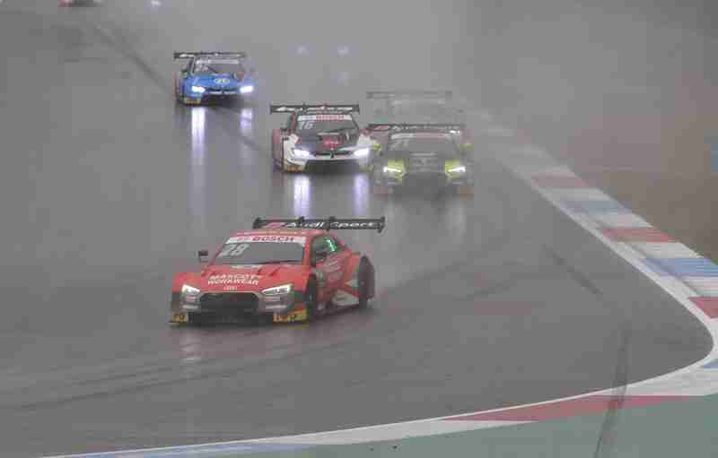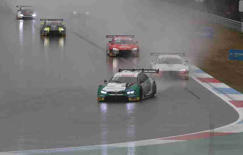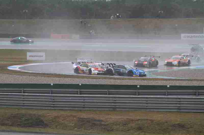 Als die Piloten am Samstagmittag in ihre Startaufstellung fuhren hatte sich das Wetter geändert. Es hatte zuvor geregnet und es tröpfelte immer noch leicht. Als die Piloten dann in ihre Einführungsrunde fuhren, fing es stark an zu regnen. Aus Sicherheitsgründen schickte man das Safety Car hinaus und es wurden zunächst zwei Runden hinter diesem Fahrzeug absolviert. Da der Regen immer stärker wurde, blieb das Saftey Car weiterhin draußen. Nach drei Runden gab die Rennleitung dann das Rennen frei. Man startete hintereinander. Marco Wittmann konnte seine Führung behaupten, aber Rene Rast blieb direkt im Windschatten. Im hinteren Feld drehte sich Sheldon van der Linde und konnte nun hinterher eilen. Die ersten beiden konnten sich ein wenig absetzen.