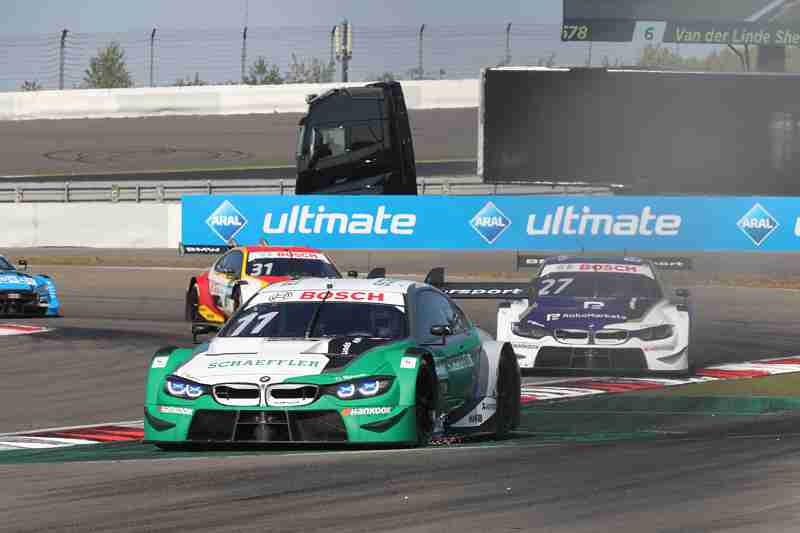 Eingangs der Start und Zielgeraden lagen Teile vom Fahrzeug von Timo Glock auf der Strecke und sofort wurde das Safety Car hinausgeschickt. Der Re-Start erfolgte nach vier Runden und ging zu Gunsten von Robin Frijns aus. Die Ampel wurde sehr spät auf Grün umgeschaltet. Nach der ersten Runde berührten sich Jamie Green und Nico Müller, mit der Folge, dass der Tabellenführer am Ende des Feldes lag. Er musste das Feld jetzt von hinten aufräumen. Zuvor war Nico Müller mit Marco Wittmann aneinander geraten. Der Brite konnte im nach hinein dem Schweizer nicht mehr ausweichen. Sheldon van der Linde hatte sich bereits von Rang elf auf Platz sechs nach vorne gefahren.