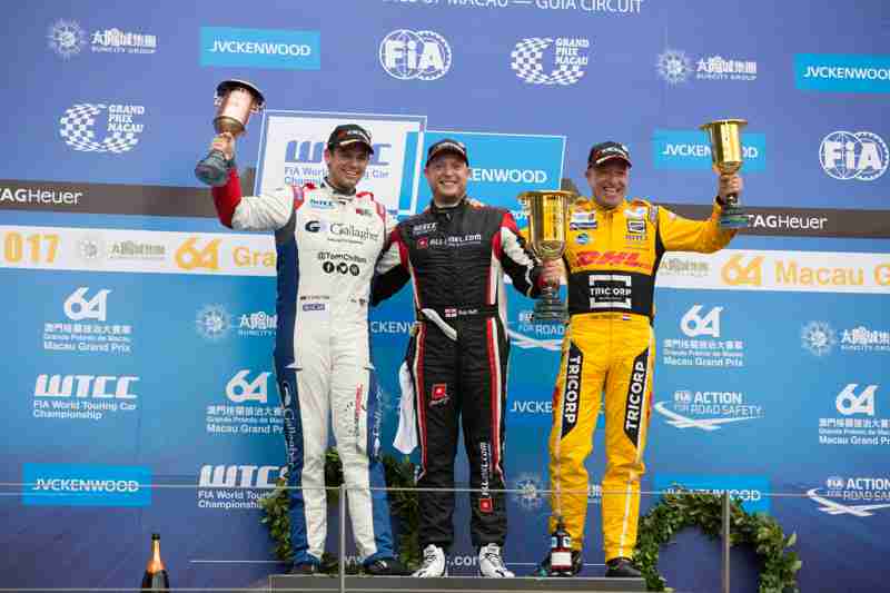 Immerhin konnten beim Hauptrennen am Sonntag alle Betroffenen des Samstags-Unfalls wieder ins Rennen gehen – und aufs Podium fahren. „Auch bei uns sah es gegen Mitternacht nicht nach einem Start im Hauptrennen aus“, lächelte Rob Huff nach seinem Macau-Sieg. „Die Jungs von All-Inkl.com haben aber einen tollen Job und den Civic wieder flott gemacht.“ Und dabei waren sie so erfolgreich, dass dem Briten ein überlegener Sieg gelang: Der neunte seiner Karriere in Macao, womit Huff auch einen Rekord aufstellte. Bei schwierigen Bedingungen behielt er einen kühlen Kopf, holte auf dem 6,12-km-Kurs seinen ersten WM-Sieg seit April 2016. Damit war er außerdem der zehnte verschiedene Rennsieger in der WTCC-Saison 2017.