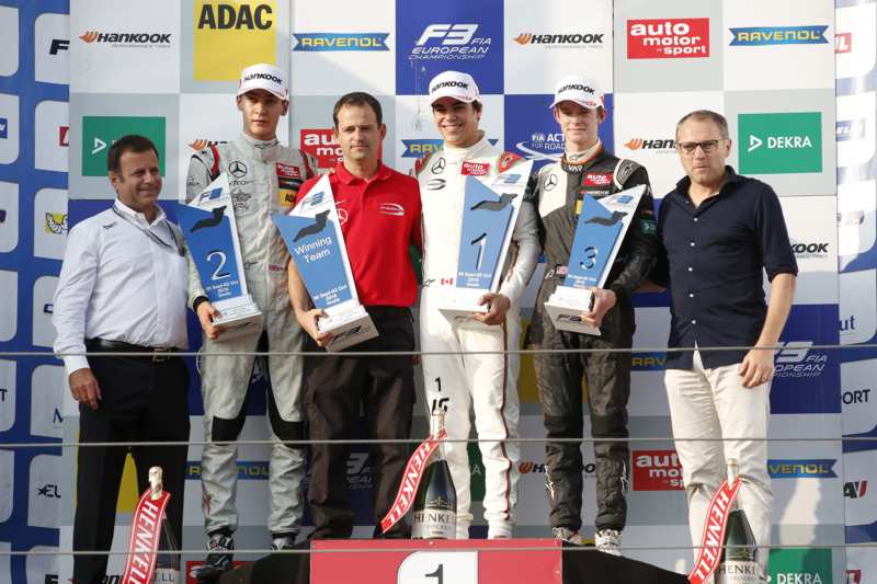 Als sich der zu diesem Zeitpunkt sechstplatzierte David Beckmann in Umlauf 15 drehte und in die Streckenbegrenzung einschlug, neutralisierte das Safety Car zum dritten Mal das Treiben auf der Strecke. Und auch beim dritten Restart blieb Lance Stroll hellwach und behielt Platz eins vor Joel Eriksson und George Russell. In dieser Reihenfolge sah das Trio nach insgesamt 19 Runden auch die Zielflagge, was Lance Stroll den vorzeitigen Meistertitel der FIA Formel-3-Europameisterschaft bescherte. Ralf Aron, Guanyu Zhou, Anthoine Hubert, Nick Cassidy, Harrison Newey, Niko Kari und Mikkel Jensen komplettierten die Top Ten. Dabei überholt der zehntplatzierte Däne seinen russischen Rivalen Nikita Mazepin erst in der letzten Runde und verhinderte so den dritten Top-Ten-Platz des Schützlings vom Force India Formel-1-Team.