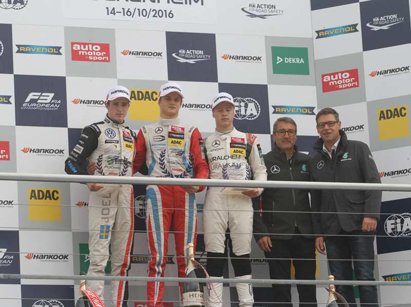 Im Kampf um den zweiten Platz in der Fahrerwertung muss Maximilian Günther, einer von zwei deutschen Startern im Feld, noch drei Rivalen fürchten: George Russell (HitechGP), Nick Cassidy (Prema Powerteam) und Callum Ilott (Van Amersfoort Racing). Joel Eriksson hingegen muss mit Ralf Aron (Prema Powerteam) und Anthoine Hubert (Van Amersfoort Racing) nur noch zwei Kontrahenten im Ringen um den Rookie-Titel im Auge behalten. Maximilian Günther und Joel Eriksson gehen mit einem guten Vorsprung auf ihren jeweils stärksten Konkurrenten ins letzte Rennwochenende des Jahres 2016, an dem maximal noch 75 Zähler zu holen sind. Der Prema-Pilot sammelte bisher 36 Punkten mehr als George Russell, während der Motopark-Fahrer in der Rookie-Tabelle sogar mit einem Vorsprung von 39 Zählern auf Ralf Aron nach Hockenheim reist. Versüßt wir der Kampf um die ersten Plätze in der Rookiewertung auch durch das von der FIA ausgeschriebene Preisgeld. 200.000 Euro werden dabei in dieser Saison insgesamt an die Rookies ausgeschüttet. Der Fahrer, der den Rookie-Titel gewinnt, erhält davon 100.000 Euro. Die Fahrer auf den Positionen zwei und drei in der Rookie-Endwertung erhalten jeweils 50.000 Euro.